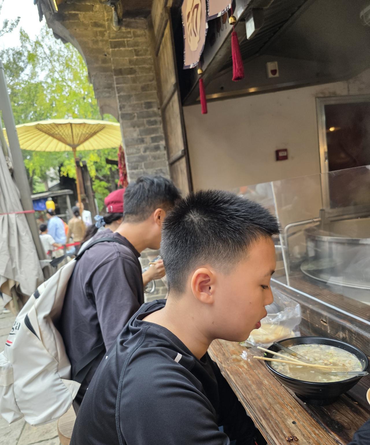 女儿一家今天玩得很开心,尤其是外孙…… 上午11:30到达古城,下午4:30离开。这5个小时,我在古城里走了一万两千多步,身体不累,脚有点累。很久没走这么多路,这双诞生于1963年的脚有点招架不住。 外孙蹦蹦跳跳走了一万五千多步,不但没见他累,而且精力还那么旺盛。 女儿一家很喜欢这个古城,尤其喜欢城里的泉,墨泉,百脉泉,梅花泉,漱玉泉,麻湾泉,个个泉水喷涌,水质清澈,惹人喜爱。 游完古城,坐着船出来,遇到一个很有趣的船工,他摇着橹,吹着牛,把一份原本很辛苦的工作,渲染得轻松无比,自豪无比,骄傲无比。他说每天工作8小时,每月工作七八天,每月能发一万多,而且每年13个月工资,享受公务员待遇。 下了船,外孙说饿了。因为坐着船出了城门,这又步行回城内美食街,找地方吃饭。找来找去,女儿女婿决定吃泉水羊肉,问我可以不可以,我说可以。 我有个原则,跟孩子们在外面吃饭,从来不主动表达自己的想法,孩子们吃啥我随着吃啥,从不说“我想吃什么” “不想吃什么”,我没有那么多毛病,我会上将就孩子,而不是让人家随我。 其实我感觉这个泉水羊肉一般,并不想吃,但他们决定了,我不能扫他们的幸。事实上就是一般,七八片薄如蝉翼的羊肉,加一碗汤,卖38元,这可是一斤羊肉的价格。但是,无滋无味。 正吃着饭下起小雨,外孙更加兴奋,一边喊着下雨了下雨了,一边在雨里跑来跑去。这种正在退却的天真,七分幼稚,三分成熟,更让人觉得孩子就是孩子,于是也更羡慕孩子——可以无拘无束,可以尽情表达,无牵无挂,无忧无虑…… 返程时女婿要替我开车,我没让他。他感冒了,这几天进进出出都是我开,我想让他在车上睡会儿,休息休息。 回到家6点,摘了露台上的扁豆和辣椒,炒了一盘,又炒了一盘白菜,一盘大葱鸡蛋,吃的米饭。女儿女婿吃的很少,他们点了一份麻辣小龙虾——晚上有球,他们习惯边吃龙虾边篮球。 球赛开始后,女儿女婿吃着看着,外孙跟着手机APP健身,我在书房里写文章、编视频,lucky在我脚下趴着打盹,窗外,淅淅沥沥的秋雨下得正紧。 女儿说明天有中雨,不出门了,明天上午准备馅儿,晚上包饺子。这样的话,明天上午我就出去绞肉馅儿。