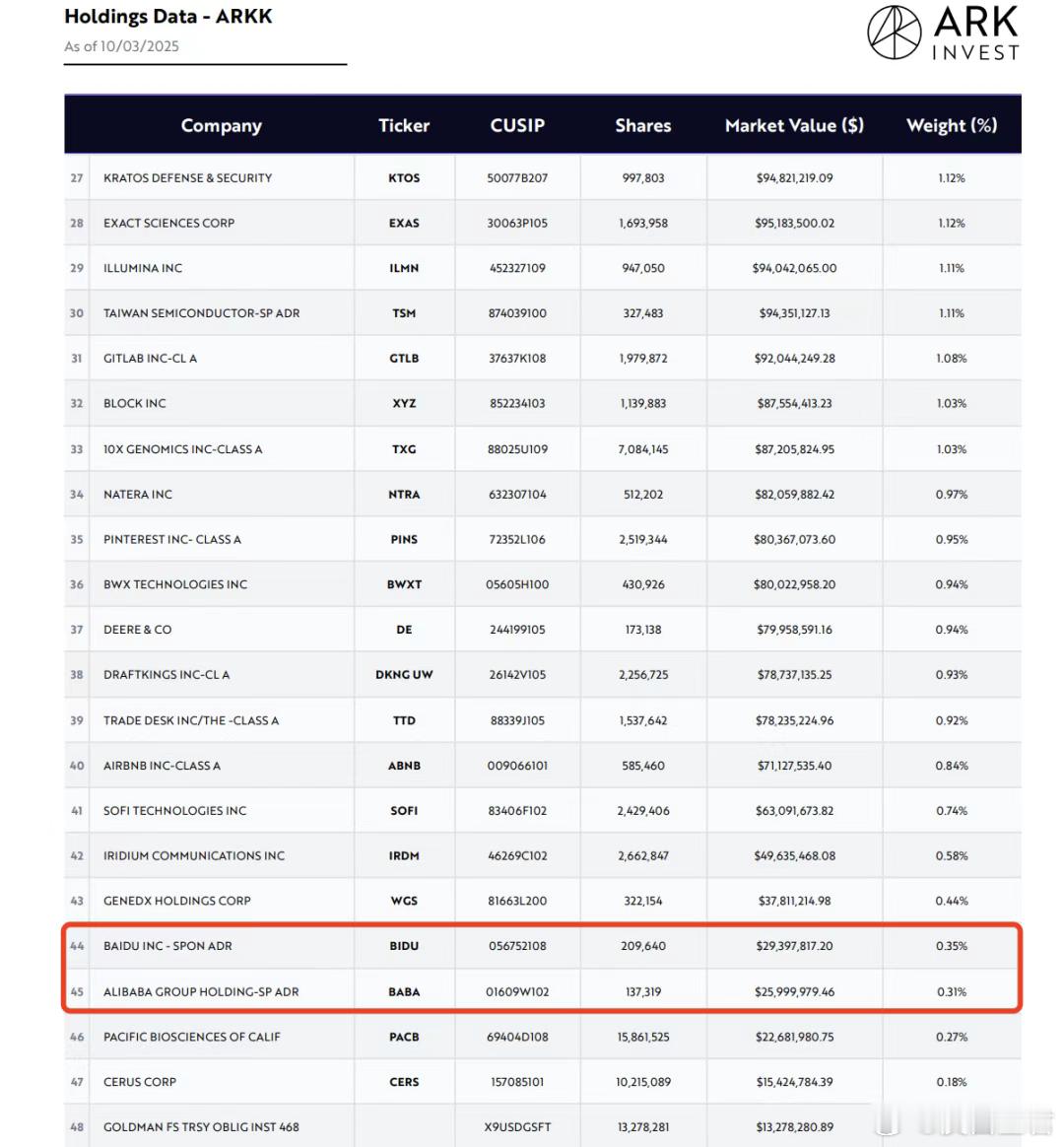 ARK对阿里巴巴的投资可追溯至2014年其IPO后,但在2021年9月的四年里,没有出现任何与阿里巴巴相关的投资或代理投票记录,此次重启持仓标志着对中国科技股重新关注。从9月22日开始的一周多时间里,方舟投资对阿里巴巴和百度的买入动作十分密集,尤其是在其旗舰基金ARKK中。连续加仓反映华尔街基金经理木头姐对中国资产的积极态度。截至10月3日,ARKK对百度的持仓市值达2940万美元(占ETF权重0.35%),阿里巴巴为2600万美元(占比0.31%)。