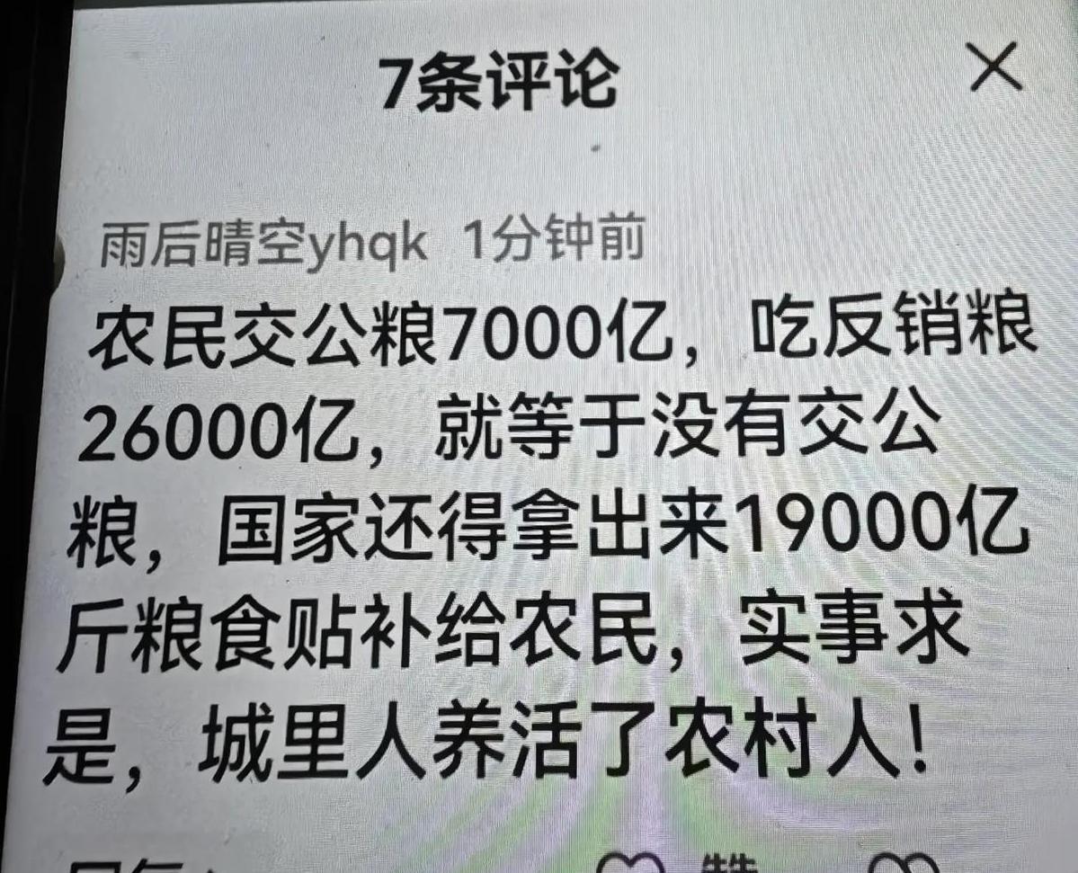全国农民交了7000亿斤公粮,全国农民吃掉的返销粮达26000亿斤。请问,190