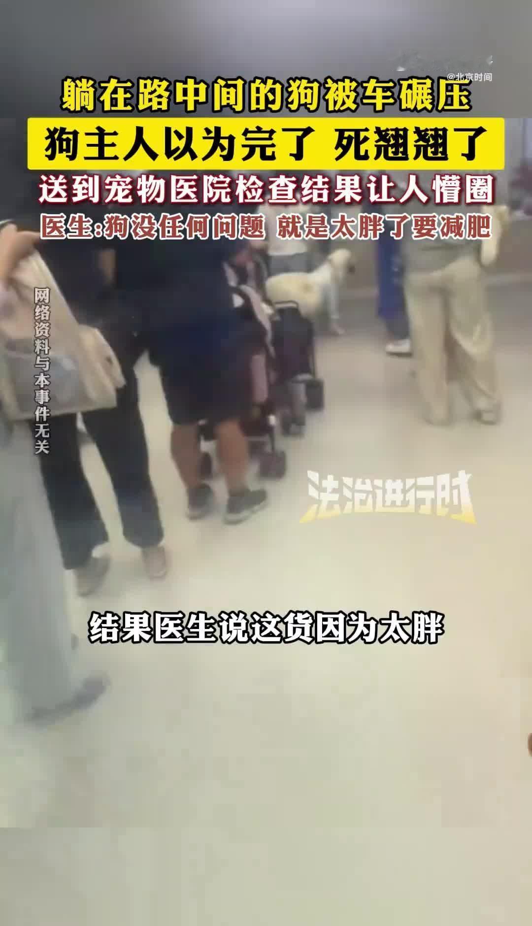 128 斤胖狗躺路中间被路过车辆碾压毫发无损,这是怎么做到的? 10月2日,浙江杭州。狗躺在路中间,黑车没看见狗直接碾压上去,狗主人以为完了死翘翘了,送到宠物医院检查结果让人懵圈。医生称狗没任何问题,就是太胖了要减肥。 ------------------------------------ 看样子是个轩逸,还好是日系车。四分之一的重量也就300公斤吧,后面前轮还被拱起来了重心后移最多200公斤的压力。 换个新能源可能就凉凉了