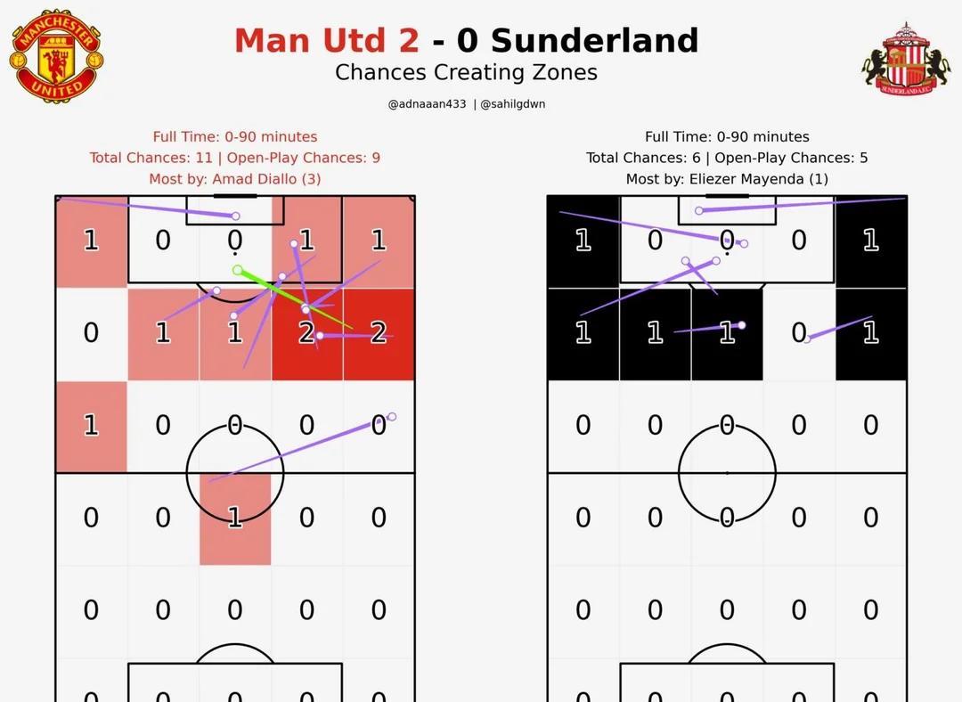 曼联2-0桑德兰的比赛,最大的变化是控球方向的变化 下图应该非常清晰了:曼联中后场的控球,大部分都转移到右路进行,也就是约罗+卡塞米罗+阿玛德迪亚洛的三角。我记得之前分享过曼联前六轮的主要站位图,那时候曼联的主要控球方向,是卢克肖+B费这一侧。 所以,这一次变化应该是打了桑德兰的一个措手不及。曼联现在需要这种变化,让对手猜不透你到底从什么位置主攻,要不然谁都容易进行针对性防守,虽然赢了桑德兰,不过曼联的问题并没有解决,接下来的比赛稳定不下来,还是容易崩的,需要小心小心再小心。
