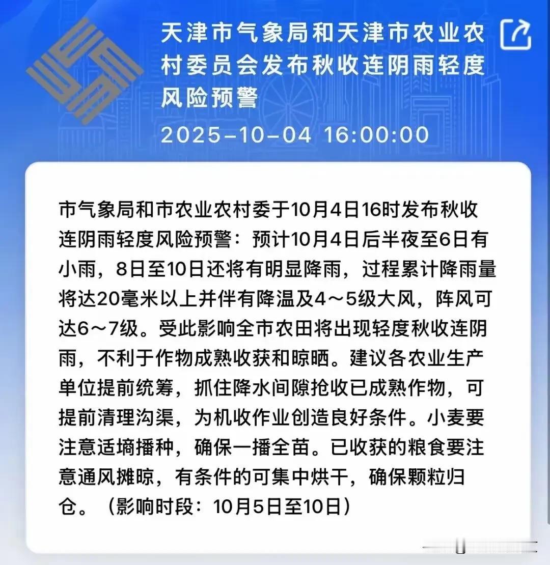 2. 天津发布秋收连阴雨轻度风险预警:天津今起连续阴雨、换季式降温,最高温降至10℃出头,最低气温个位数,未来10天降水量达50 - 100毫米,市气象局和农业农村委发布秋收连阴雨轻度风险预警。中央气象台发布台风“麦德姆”红色预警,多部门升级防御响应。6日晚京津冀或无缘中秋圆月,今年中秋是本世纪最晚之一。
