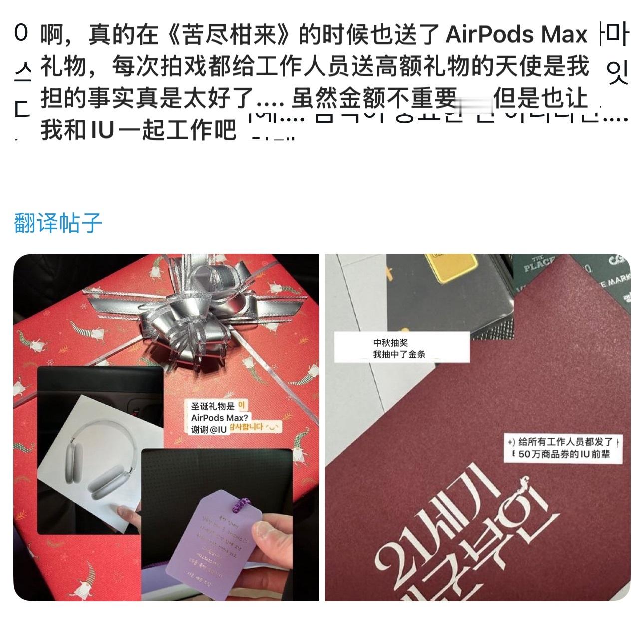 IU给剧组每个工作人员都发了50万商品券[捂嘴哭]