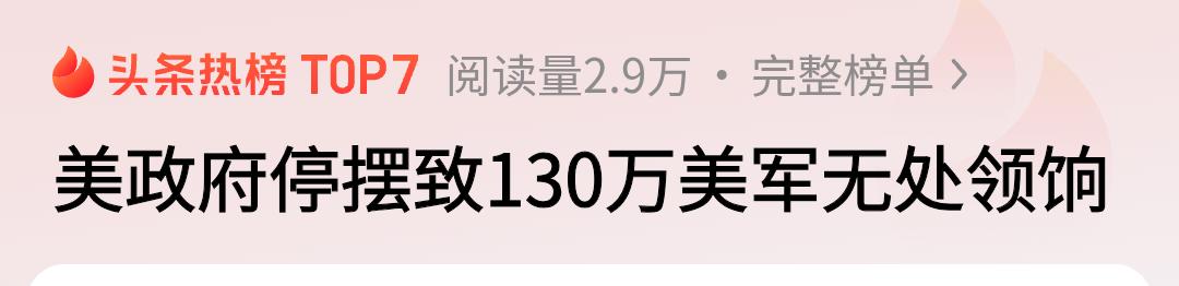 特朗普下手太狠了!为了迫使美国民主党在政府预算拨款案上妥协,他先是发出联邦政府将大规模裁员警告,接着又借联邦政府停摆给130万美军停饷!真的是不怕事大啊!美军军属5点起床排队领救济,美军军心能好吗?前几天特朗普和赫格塞思刚给近千美军将领开过“军容风纪”整顿大会,接着就停饷,这“整顿”手法太别开生面了!