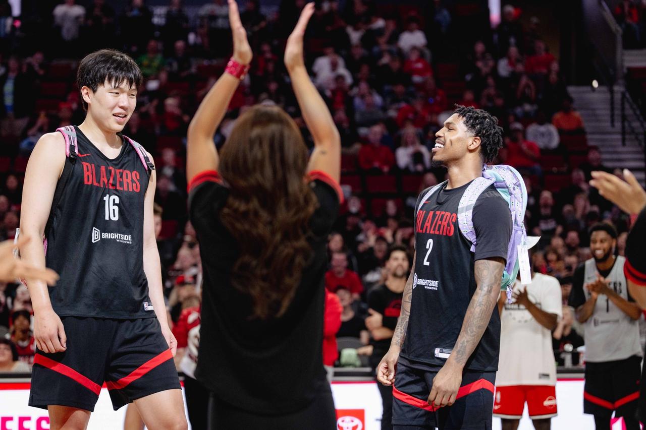 到哪都是最靓的仔!杨瀚森在开拓者球迷嘉年华活动中,背着粉色的小包包,和啦啦队美女们一起载歌载舞,氛围无比活跃!