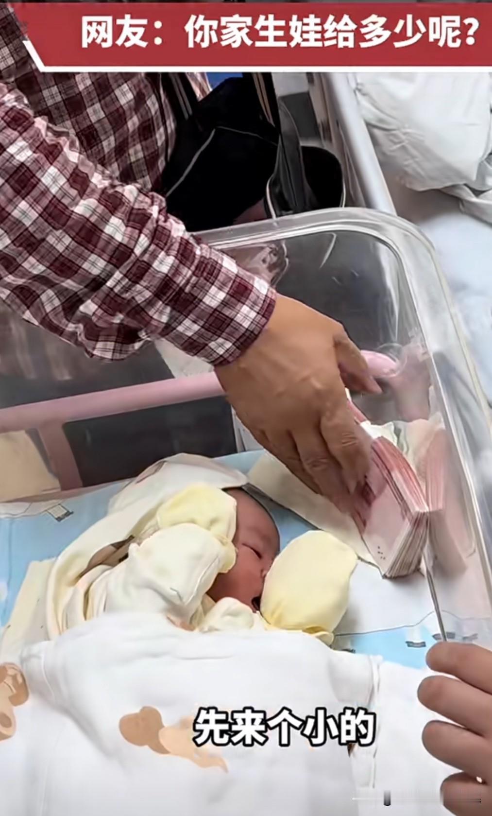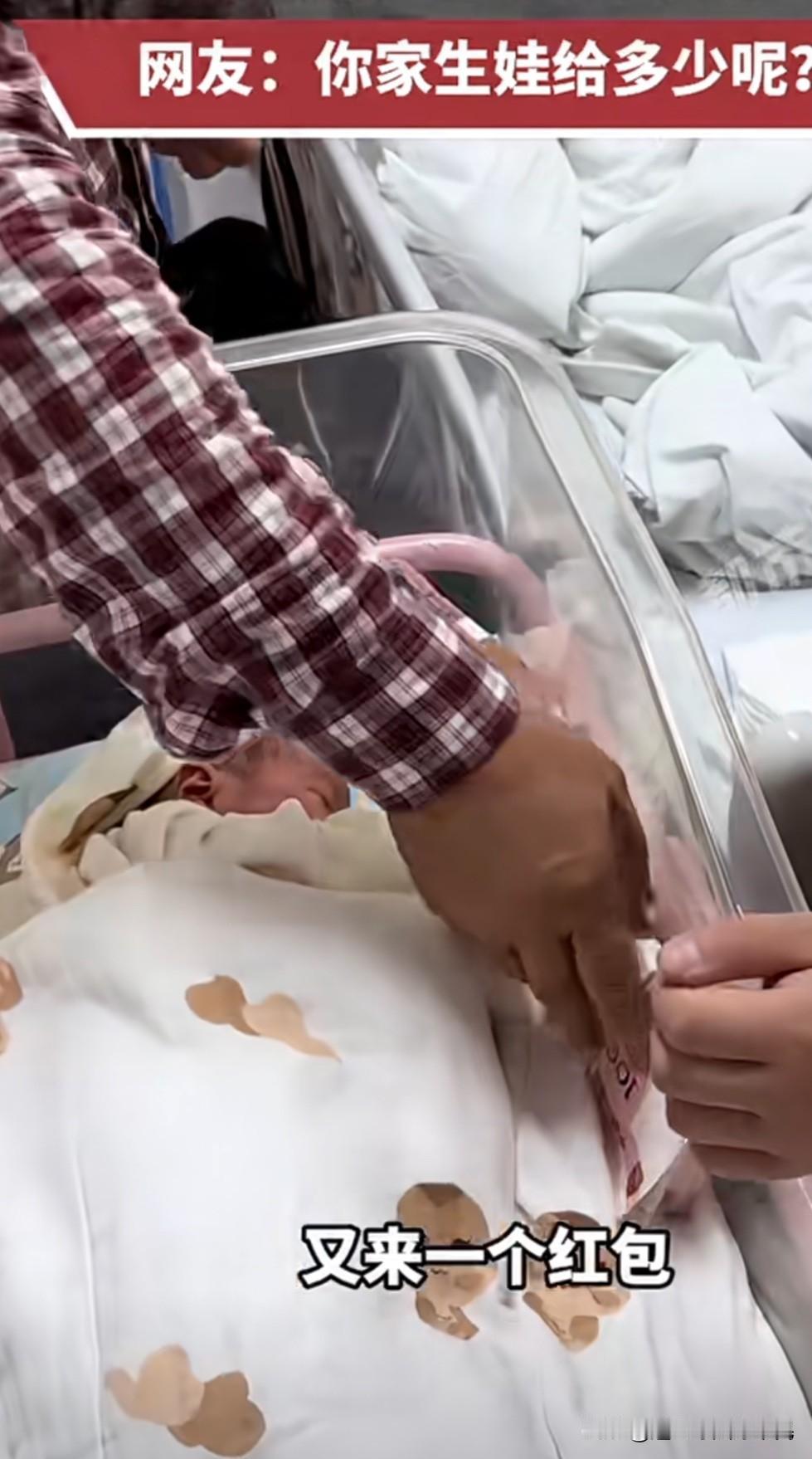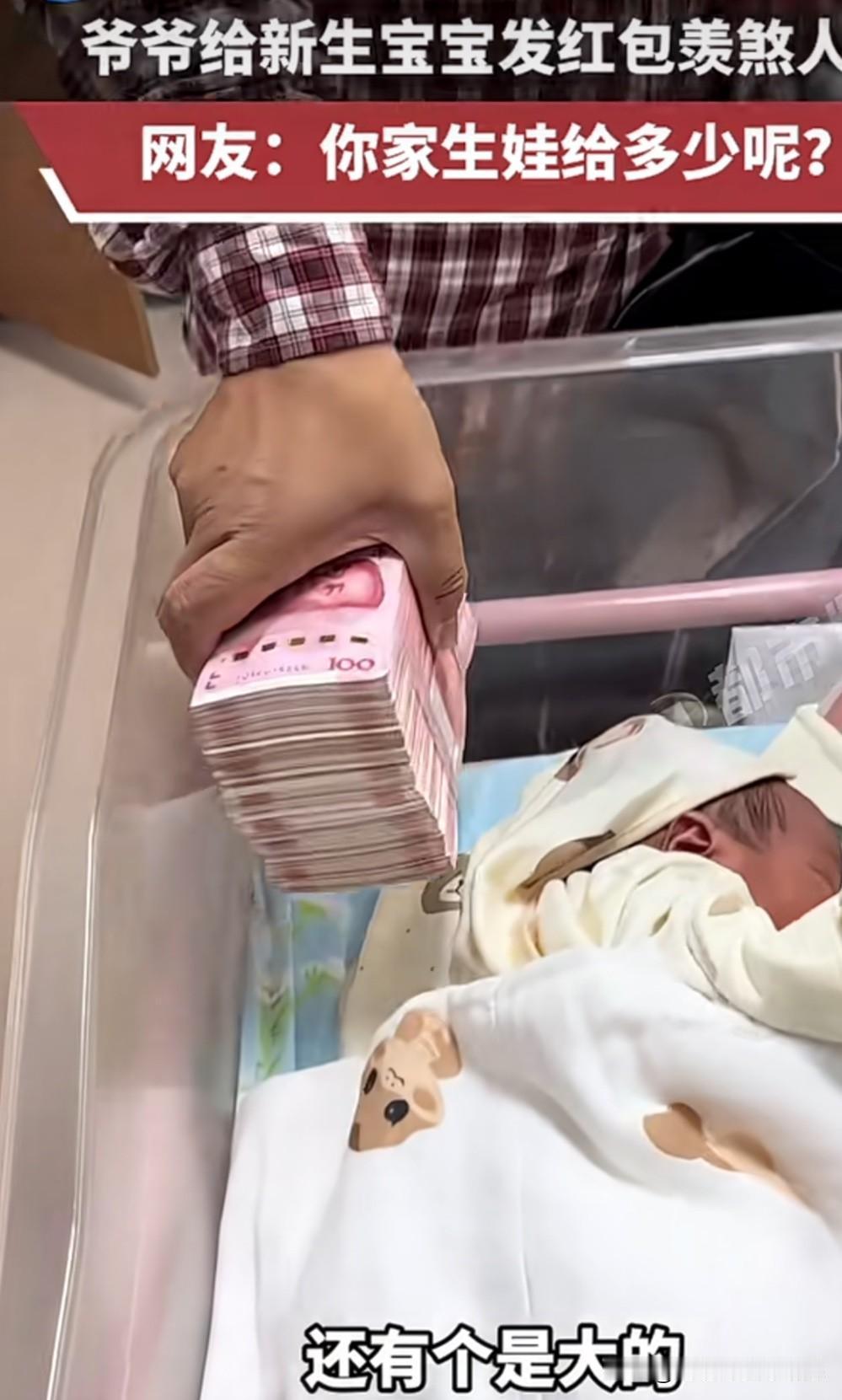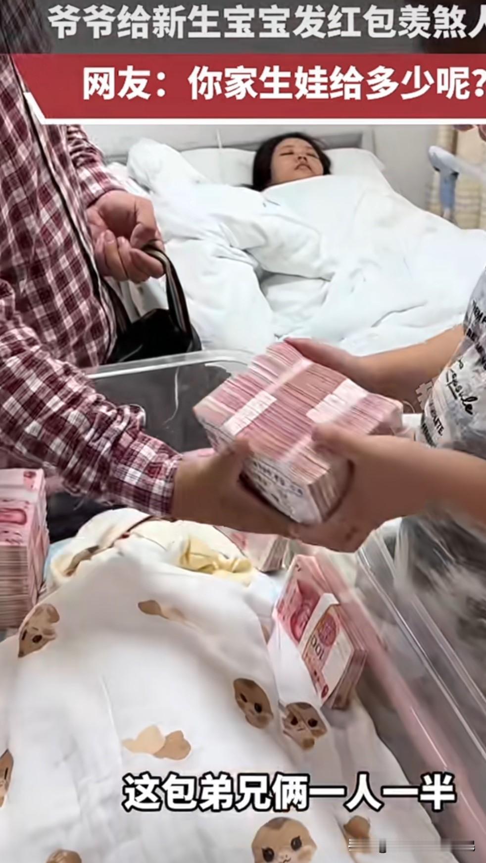 爷爷给新生宝宝发红包🧧 让人好生羡慕吖 新生的宝宝是二胎 爷爷先是放了“小红包”一万元,又放一个“小红包”一万元,然后就开始给新生宝宝发大红包,真真切切的一捆10万元,旁边站着一胎的大孙子,爷爷又拿出一捆10万元给大孙子,哈哈哈 这种给新生宝宝的红包的爷爷想必大家都喜欢吧! 其实把心态放平吧,可不敢盲目攀比,过好自己的踏实日子就好,人最怕攀比和不知足。这种证明有钱,没钱爷爷怎么给?如果爷爷是打工的,给多给少是心意,外公也一样,还是普通人居多!