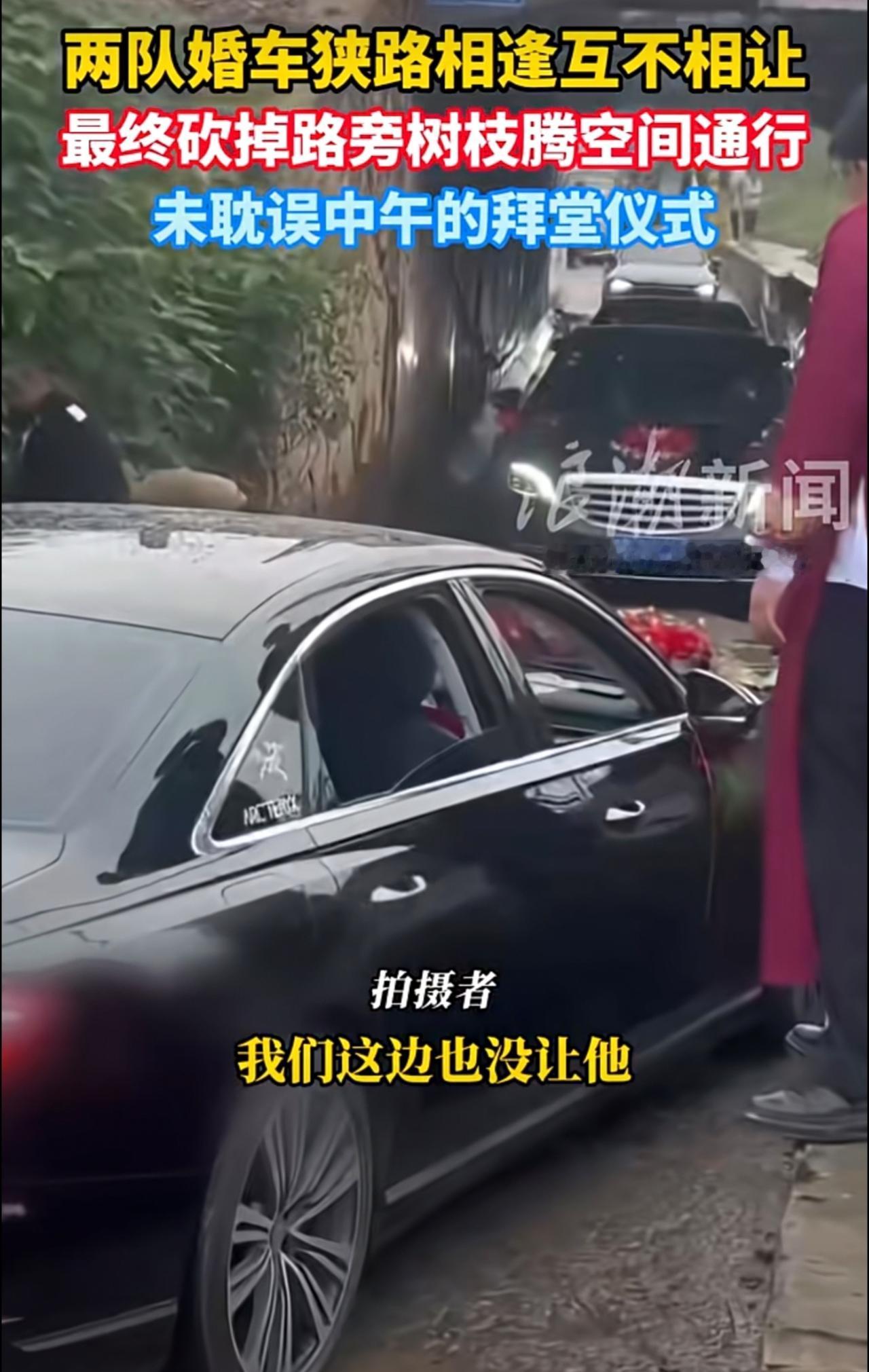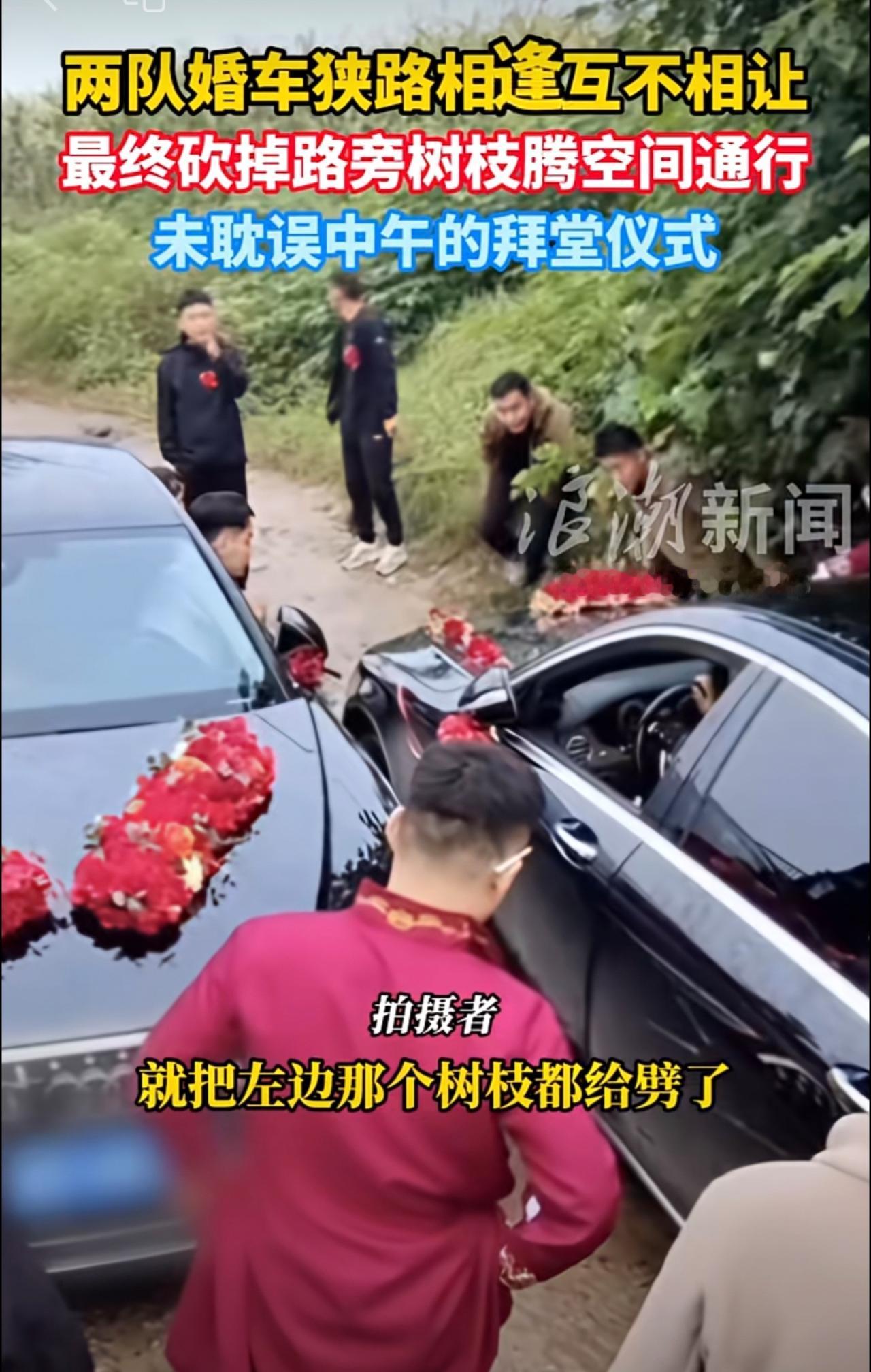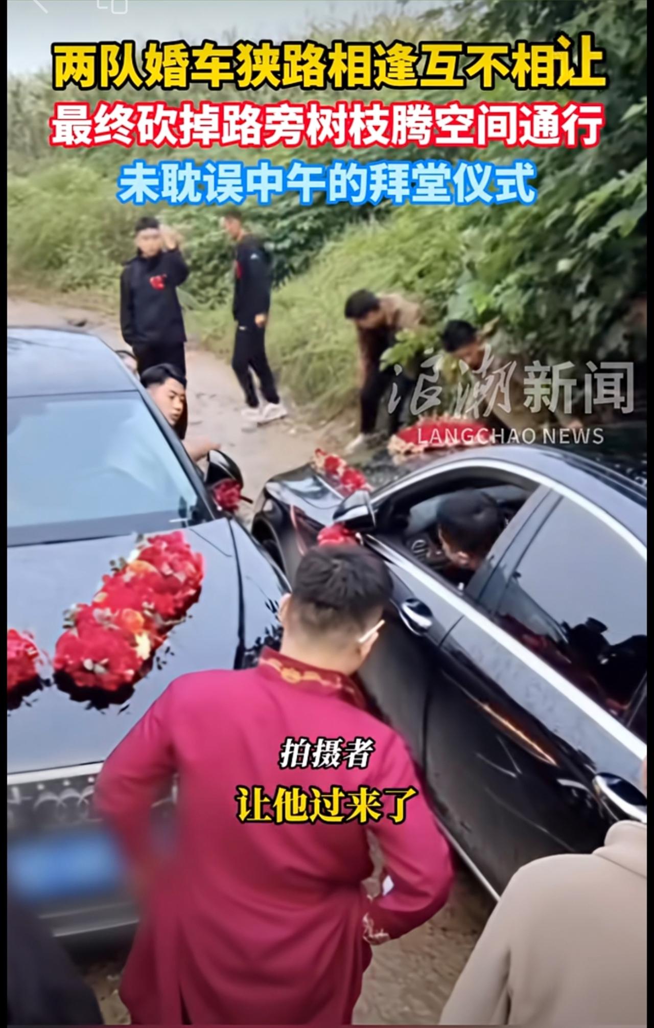 两队婚车狭路相逢互不相让 最终砍掉路旁树枝腾空间通行 未耽误中午的拜堂仪式