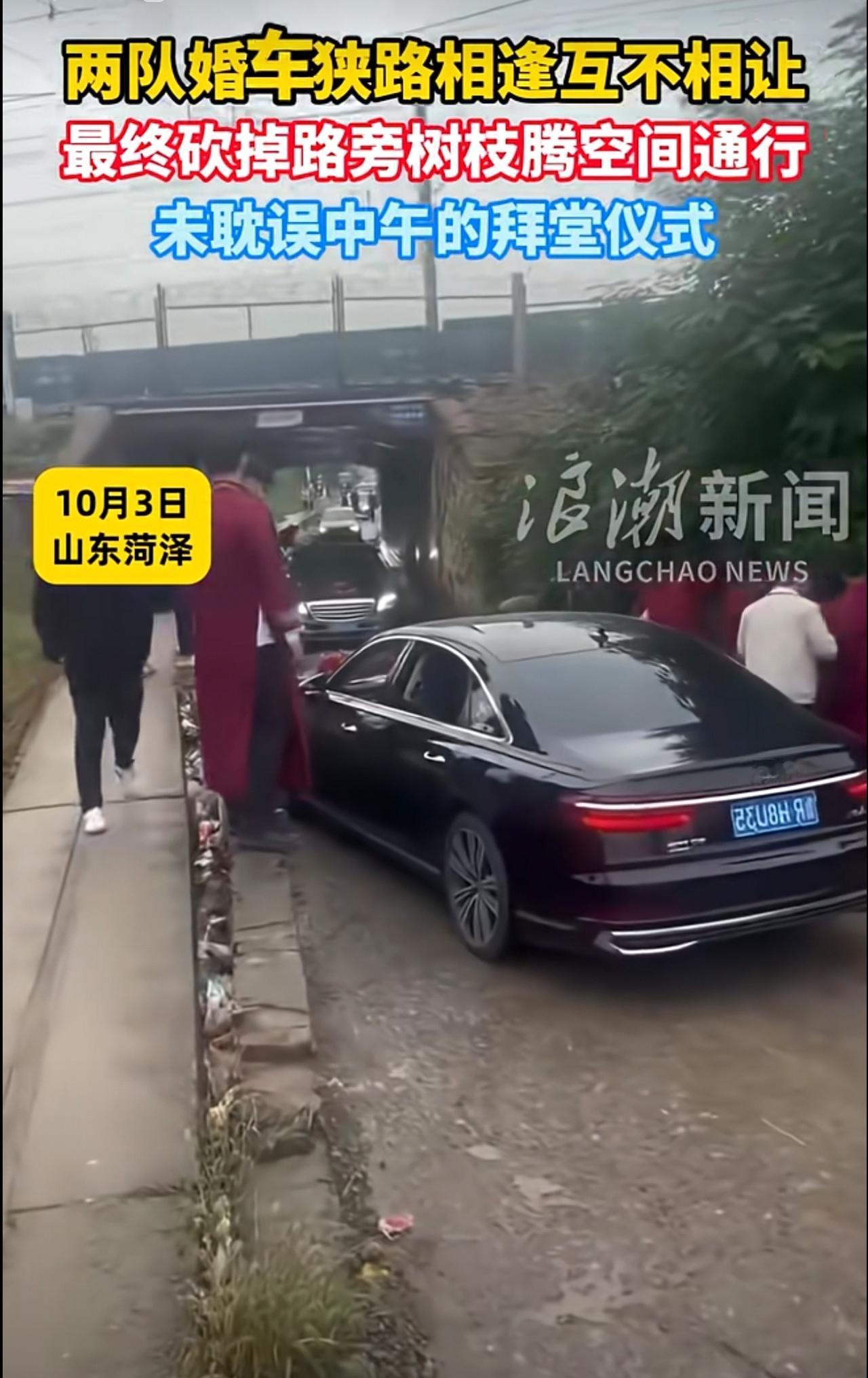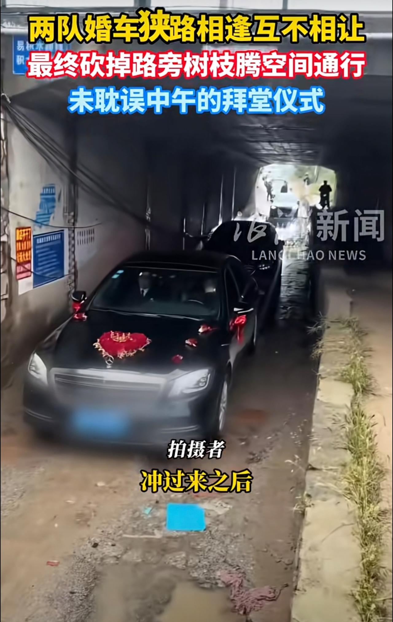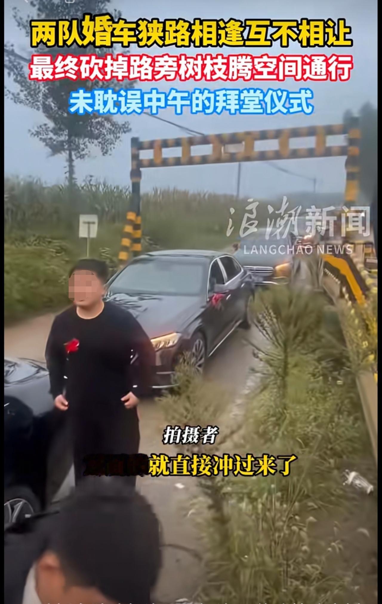 两队婚车狭路相逢互不相让 最终砍掉路旁树枝腾空间通行 未耽误中午的拜堂仪式