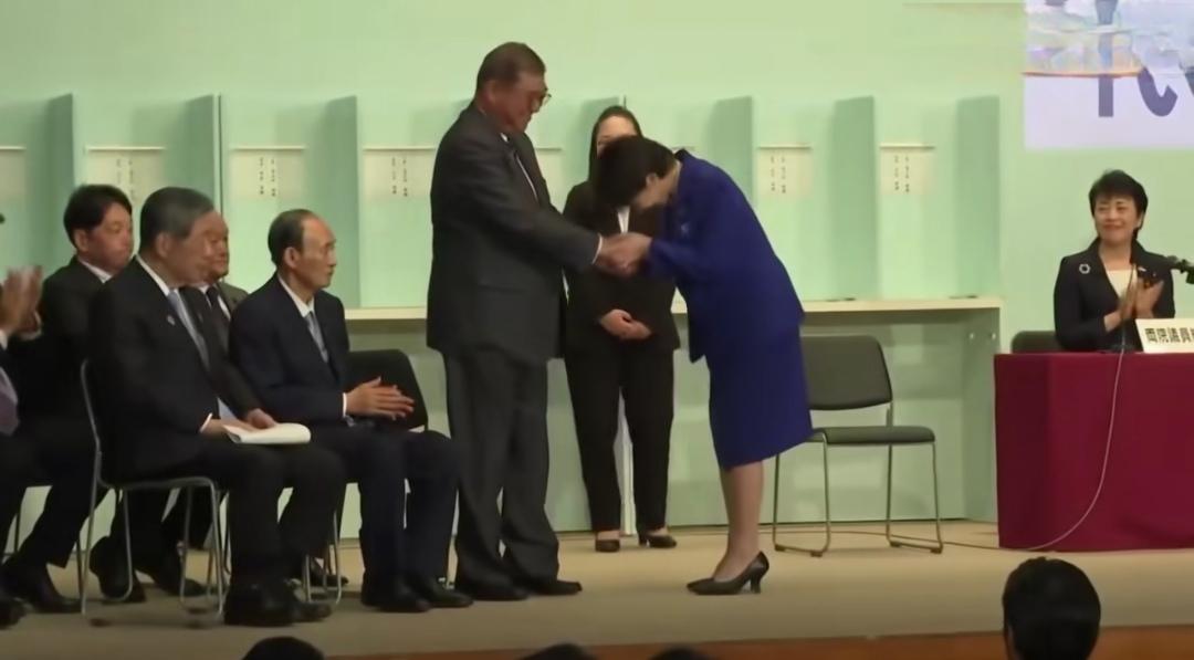 瞧瞧!人家这才叫鞠躬,妥妥的90度,分秒不差,就差跪下。 64岁高巿早苗胜选,拿下日本自民党总裁宝座,估计眼前这位上任首相石破茂,功不可没。 感谢为其“铺平道路”鞠躬、握手、点头哈腰。日本一个世界上公认的男权国家,居然诞生史上第一位女首相,真是不可思议!🫢