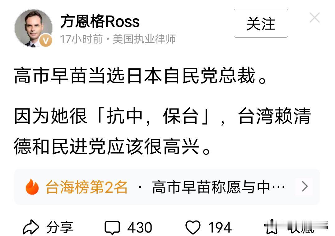 高市早苗当选,那个美国律师方恩格发了个文,评论区炸锅了! 如果高市早苗能保台,癞蛤蟆就会上天,摔死是肯定的,高市早苗们有事也是一定的。 方恩格虽然是个美国律师,但他的汉语确实不错,评论区应该能看得懂。 记得伯恩斯回到美国后就变得老实很多,不知道这个方恩格看过没有,作何感想。 劝方恩格一句:还是认真看看自己的评论区吧…… @方恩格Ross