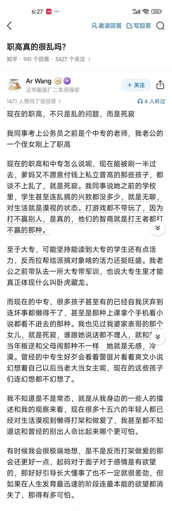 职高真的很乱吗? 我成绩不算太好 初中三年都不怎么学 一直青春期叛逆 但我初一有底子 所以中考成绩也过了普高线 但是我父母觉得我这个学习态度不适合上高中就让我去了职高 快开学了 我有点紧张 我学的是计算机平面设计 不知道怎么和职高的人相处 会很难相处吗 ------------------------------------ 存天理,灭人欲,这事儿成了
