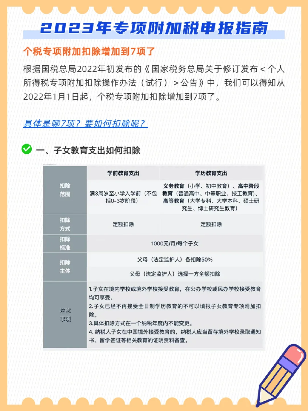 [吧唧R]根据国税总局发布的文件,我们可以得知从2022年1月1日起,个税专项附加扣除增加到7项了。具体如何扣除已经整理到图中啦❗
