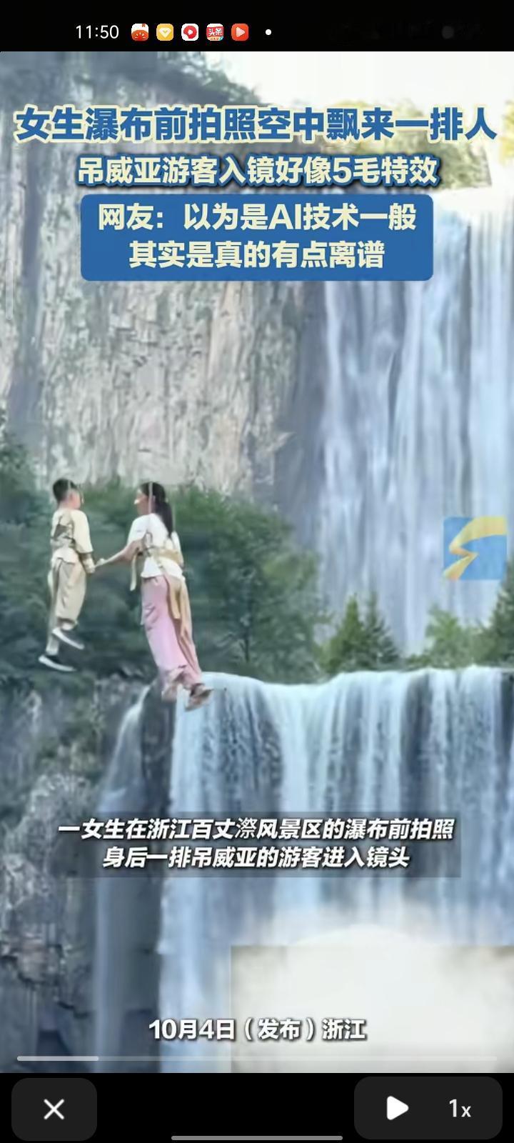 10月3日,温州市文成县。女生在百丈漈风景区的瀑布前拍照,身后一排吊威亚的游客进入镜头,如同电影中的“五毛特效”,为她的照片增加不少趣味性。这次意外不仅给女生带来惊喜,也引起不少网友的关注。