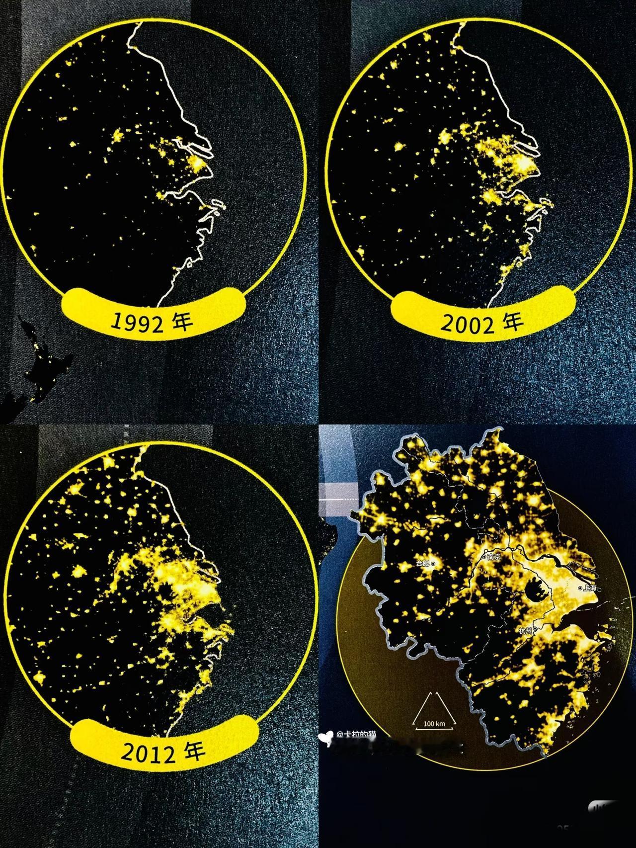 长三角夜间灯光变化,1992年—2022年。 三十年的发展进程。92年无锡还比苏州强一丢丢的[笑哭]
