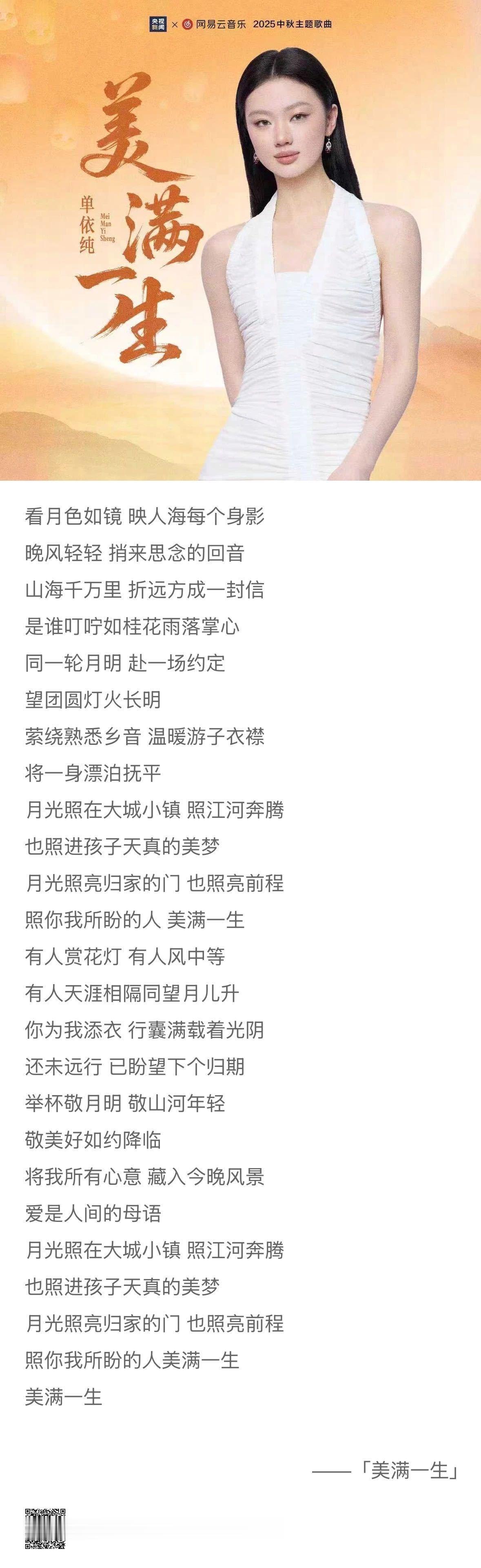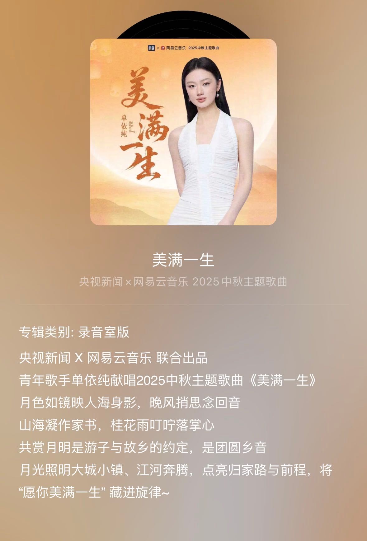 单依纯献唱央视新闻中秋主题曲 零点响起的温柔!单依纯用嗓音织就团圆旋律,《美满一生》藏尽游子心事。月光照过大城小镇,这是故乡与漂泊者的中秋约定,也是归途的序曲。