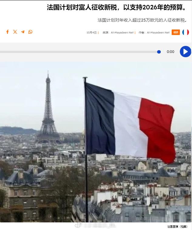 法国政府计划对个人年收入超过25万欧元或夫妻收入超过 50 万欧元的公民征收新税,计划在明年为法国政府增加30亿欧元的财政收入。