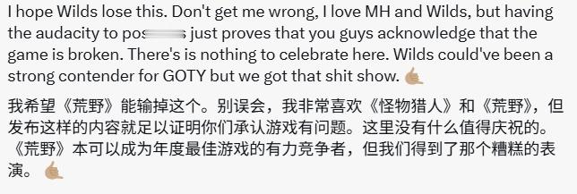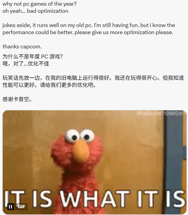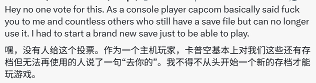 结果评论区玩家对提名表达了不满,有玩家表示:“没有人会给这个奖投票,卡普空对我们这些存档无法再用的人,说了句“去你的”,然后我不得不开始新存档。” ”如果想成为年度最佳游戏,就解决优化问题吧,我从未见过如此多的Bug。“ ”为什么不是年度最佳PC游戏呢,嗷,因为优化太差。” “这玩意儿在主机上还能运行。然而,在PC上的性能却糟糕透顶,即便在发售8个月后仍是如此。而且,直到12月都别指望有修复措施。在我看来,它不配获得年度游戏大奖。”