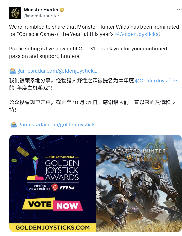 近日,《怪物猎人 荒野》获得了金摇杆「主机年度最佳游戏」的提名,《怪物猎人 荒野》官方发推呼吁投票,截止至10月31日。