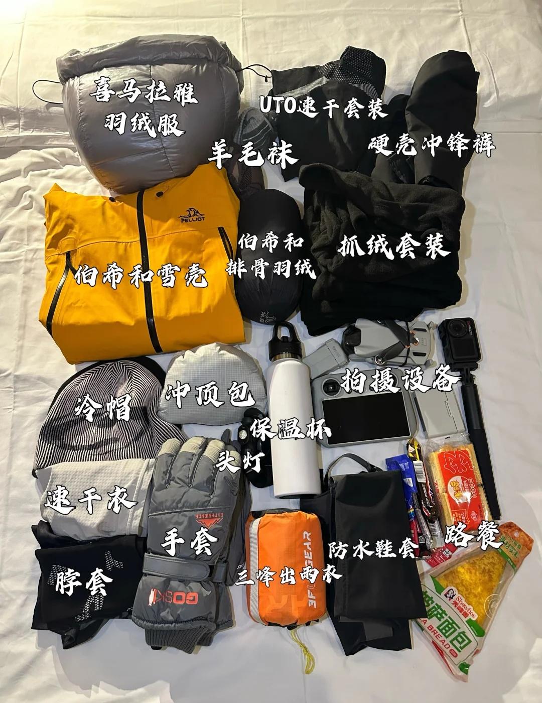 第一次爬雪山带这些,靠谱!小白必看 第一座雪山,西宁的岗什卡三峰 海拔5005米 但第一次去,最头疼的就是:到底要带些什么?🤔 带多了背不动,带少了会要命!作为一个过来人,给你们整理出来了 三层穿衣法 这是重中之重!雪山天气瞬息万变,靠的是叠加,不是一件厚羽绒服就完事儿! ⚠️1. 贴身层(排汗层):千万别穿棉! 出汗会失温警告! 要穿: 速干衣裤,能把汗水迅速排到外层,保持身体干爽。本人穿的uto整个感觉很舒服排汗速干还是很强大的 2. 中间层(保暖层):锁住空气,保持体温。 要穿: 抓绒衣 或 轻薄羽绒服 / 合成棉服。在营地休息或感觉冷的时候穿上。 大本营海拔4315米,很冷,刚去大本营就穿上了 我带的是伯希和800蓬的排骨羽绒保暖性和便携性没得说。[作揖] 抓绒一套都是迪卡农的平价好用。 [皱眉]3. 防护层(外壳层): 绝对不能省! 防风、防水、防雪 要穿: 硬壳冲锋衣裤(看准防水指数)。 我穿的伯希和雪壳鲜艳的颜色很适合雪山拍照📷怕山顶拍照冷还带了一件喜马拉雅的外穿羽绒服 头部:羊毛帽必备上了大本营尽量不要脱下来,保暖到位可以让你尽快适应高反 魔术头巾/面罩: 护脸防晒防风,还能当围脖,一物多用。 手部(非常重要!): 内胆手套: 薄款速干,方便操作手机、相机。 外层防水厚手套: 登顶或下雪时用,保暖防冻伤。 [赞]脚部(你的根基!): 登山袜: 羊毛袜!至少两双,吸汗保暖防磨脚。 高帮防水登山鞋: 这是最值得投资的装备! 必须高帮防水,保护脚踝,防雪水渗入。 我穿的洛克二代平价好用 [微笑]神器: 太阳镜/雪镜: 高原紫外线+雪地反射,容易雪盲,必须戴!(出片神器) 保温杯: 在雪山上喝一口热水,幸福感爆棚,还能防失温 登山包: 30L左右冲顶包,带防雨罩。 路餐: 巧克力、能量棒,高糖食物对高反有帮助。 青海雪山附近植被很少所以很容易高反,大家一定要坚持,是身体情况而定不要勉强自己,记住,生命只有一次,山一直都在。 以上就是我的吐血整理!第一次爬雪山,装备宁可贵一点,也别拿自己开玩笑。 还有什么问题,评论区问我吧!👇 人生第一座雪山 雪山装备 雪山攀登 户外穿搭 登山干货 新手登山 爬山攻略 征服雪山 徒步装备