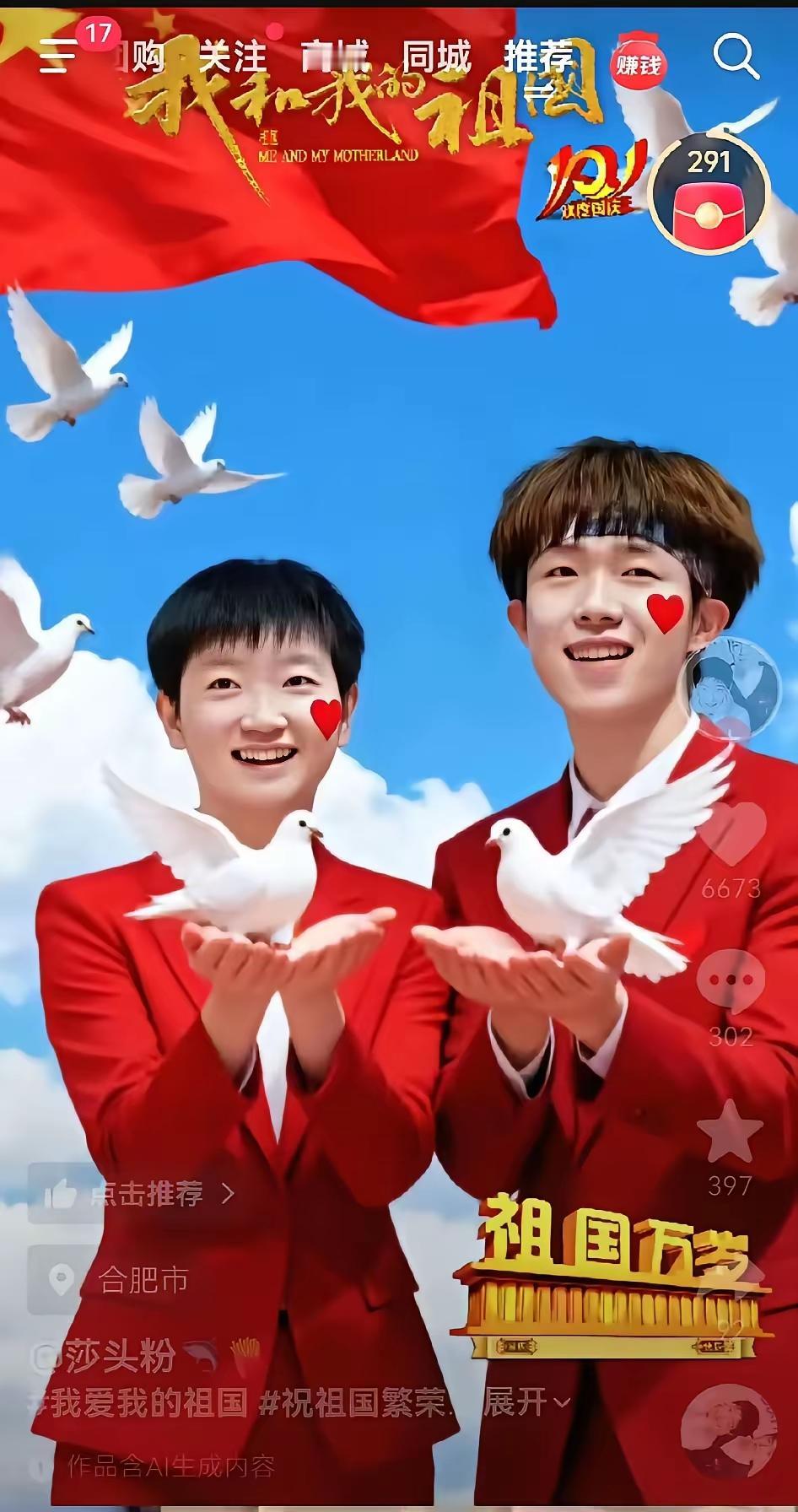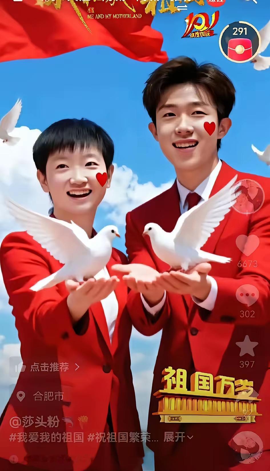 太喜庆啦! 一眼瞅着就满是喜庆劲儿, 一看就是专门为过节做的。 莎头俩穿着红色西装,身后是蓝天白云,旁边还有红旗飘着,脸上印着小爱心,双手捧着白鸽,那画面又好看又有意义,满屏都是“祝祖国万岁”“祝祖国生日快乐”的心意。 他俩可不是光有仪式感,是真把青春都献给了国家的乒乓事业,靠实力打出成绩,这样的年轻人才是最优秀的!不光要祝祖国生日快乐,也得祝莎头俩国庆开心,接下来继续健康涨球,再拿好成绩。