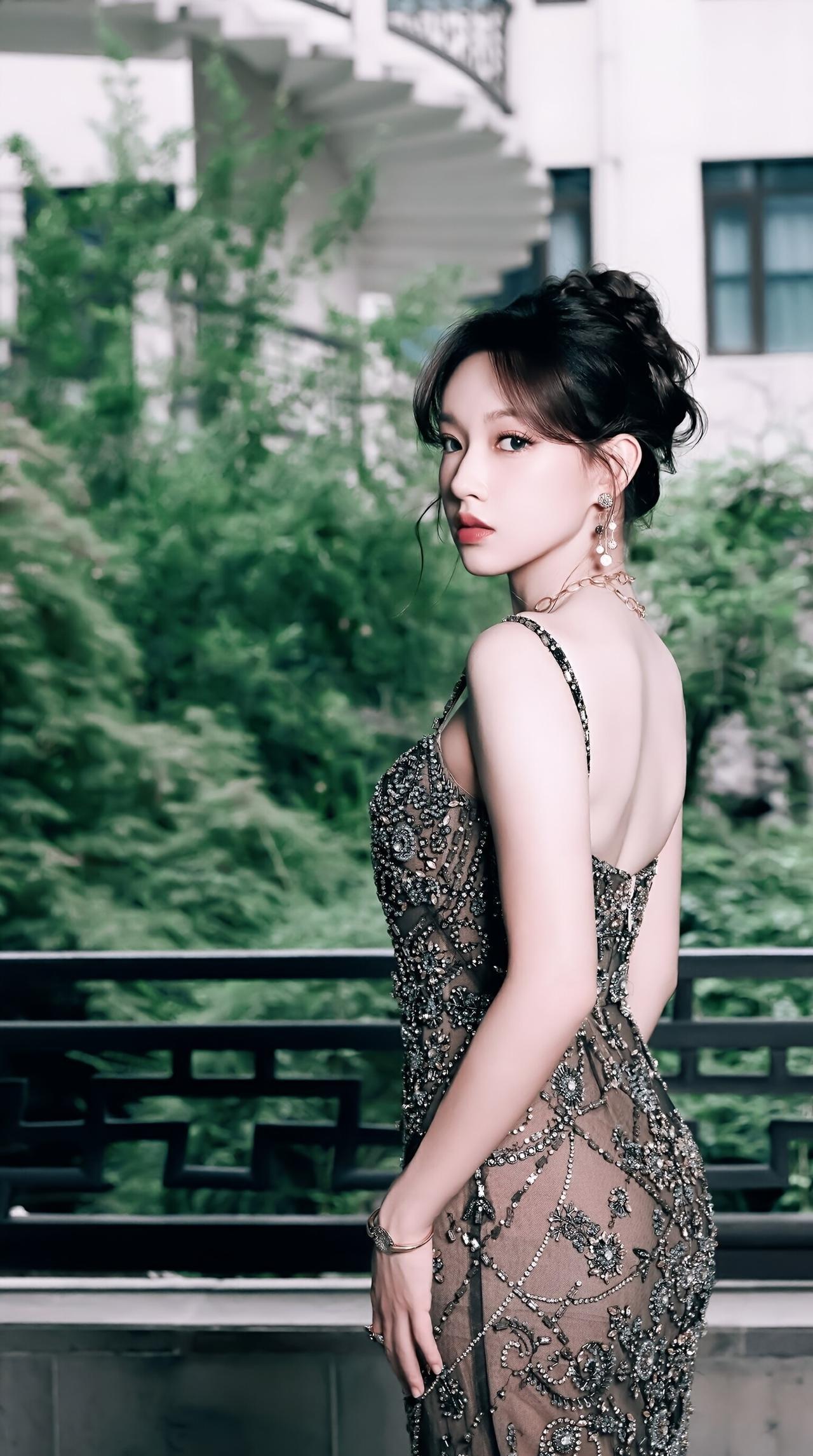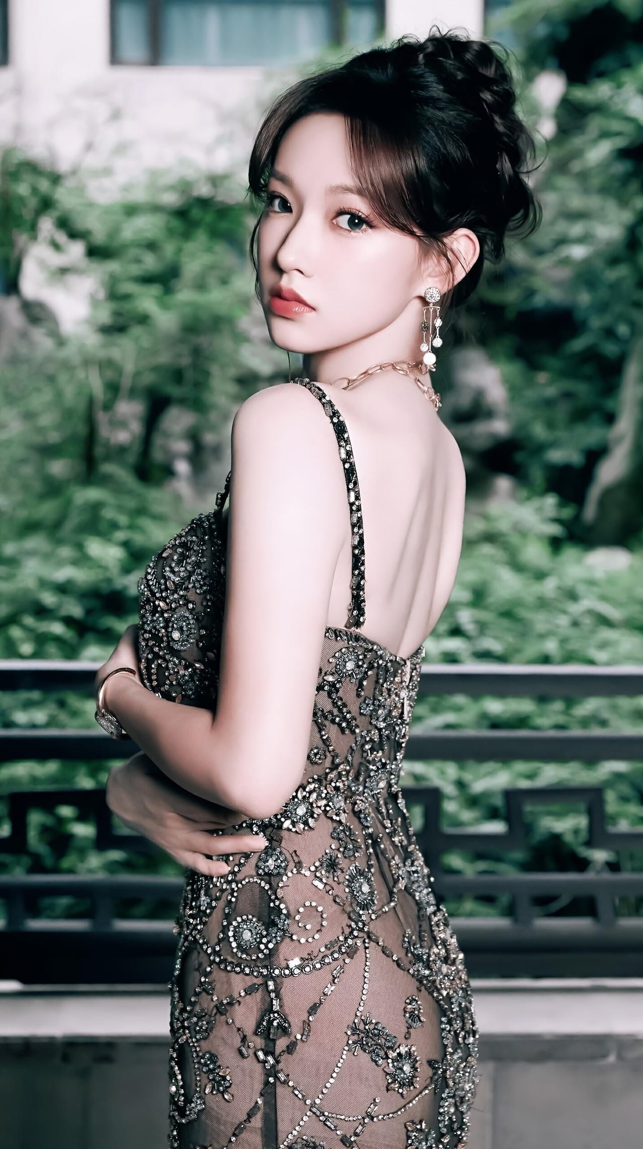 程潇一袭钻石露背吊带裙,在绿意间绽放优雅光芒