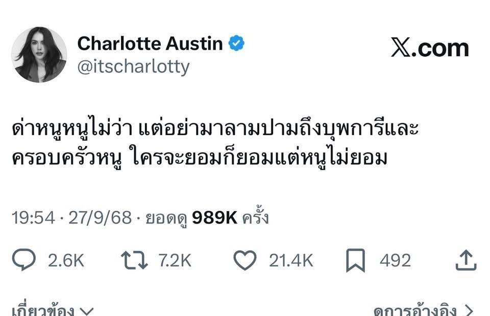 #泰国娱乐#Charlotte稍前发文:骂我就骂我,但别扯上我的父母和家人。谁