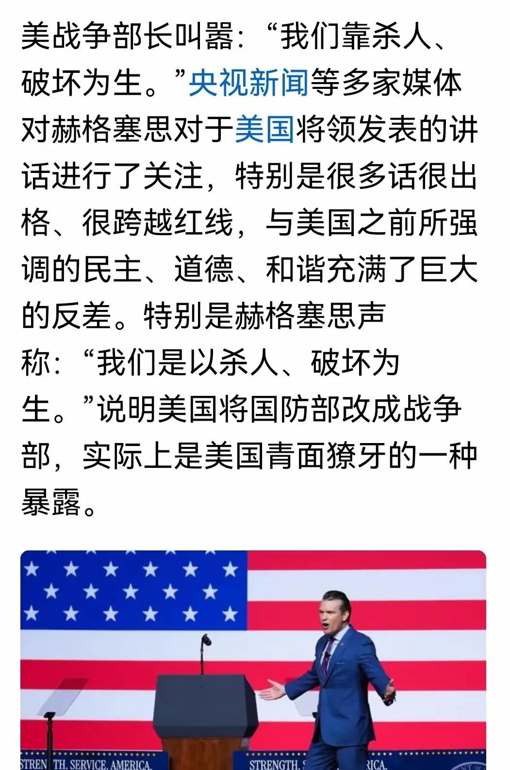 怒怼流氓 美国战争部长竟公然向全球八十亿人叫嚣:“我们一直靠杀人、破坏为生”。这不仅坐实了他们身为地球村强盗的行径,更凸显出其“不以做强盗为耻,反以做强盗为荣”“我是强盗我怕谁”的丑恶嘴脸。 听听这话说的,杀人破坏都能说得这么理直气壮,这哪是什么战争部长,根本就是个明目张胆的强盗头子,还非得把这种强盗行径拿到台面上来炫耀,真当全世界的人都傻啊。他这么一说,可把那些一直给美国icon涂脂抹粉,把美国吹嘘成“自由、民主、大爱”典范的公知们打脸打得啪啪响。这些公知平时没少吹嘘美国怎么怎么好,仿佛美国就是人间天堂,现在好了,人家自己人都承认是靠杀人破坏过日子的,这不是自己扇自己耳光嘛。 话说回来,这种赤裸裸的强盗逻辑让人想起阿富汗战场上的画面。根据联合国报告,美军在阿富汗20年间造成超过4.7万平民死亡。这就是他们口中的"维护秩序"? 看看那些被炸毁的学校医院。叙利亚阿勒颇的儿童举着残缺的玩具。利比亚的难民在海上漂泊。这些都是"杀人破坏为生"这句话背后血淋淋的现实。 公知们总爱说美国重视人权。可关塔那摩监狱至今还关着未经审判的囚犯。CIA在黑狱使用水刑。这些事难道就是他们标榜的"自由民主"? 话说五角大楼2023年军费预算达到8170亿美元。这笔钱能建多少所学校?能解决多少人的温饱问题?他们宁愿把钱花在制造杀戮上。 还记得伊拉克战争的谎言吗?一管洗衣粉被说成生化武器。十多万平民为此丧生。现在他们连借口都懒得找了,直接承认靠暴力生存。 那些吹捧美国的人应该看看拉丁美洲。危地马拉的香蕉共和国、智利的政变、古巴的封锁。多少国家被他们所谓的"民主输出"搞得民不聊生? 话说这位战争部长的坦白倒是件好事。至少让我们看清某些真相。比那些满口仁义道德,背地里尽干坏事的政客强得多。 现在的问题是,我们要继续被漂亮话蒙蔽吗?还是要认清这个弱肉强食的丛林法则?每个普通人都该好好想想。 各位读者你们怎么看?欢迎在评论区讨论。