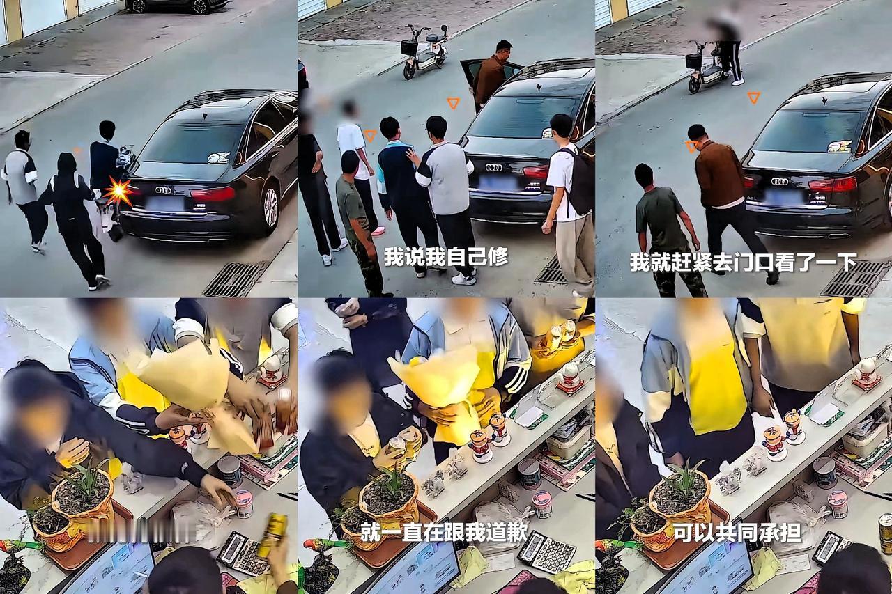 “这下好了,全国人民都知道了!”黑龙江哈尔滨几个中学生在路上玩闹,一个穿校服的学生骑电动车刮到了路边的奥迪A6 。你猜怎么着?这几个孩子居然主动找到车主认错。 车主看了看剐蹭,觉得不严重,加上孩子们道歉挺诚恳,就打算自己修。哪知道没过多久,孩子们买了鲜花和饮料送来。车主直夸:“这几个孩子教得好,难得一起担责任。” 网友们也议论开了,都觉得几个孩子一起承担,不推诿的劲儿太可贵。一个男生刮的车,小伙伴们却一起鞠躬道歉,这才是真感情! 这事儿啊,孩子们幸运碰到好车主,车主也欣慰遇到懂担当的孩子。咱们生活中,不就缺这种主动担责的态度嘛。要是大家都能这样,社会不得更和谐?你们说,遇到这种事,你们会怎么做呢?