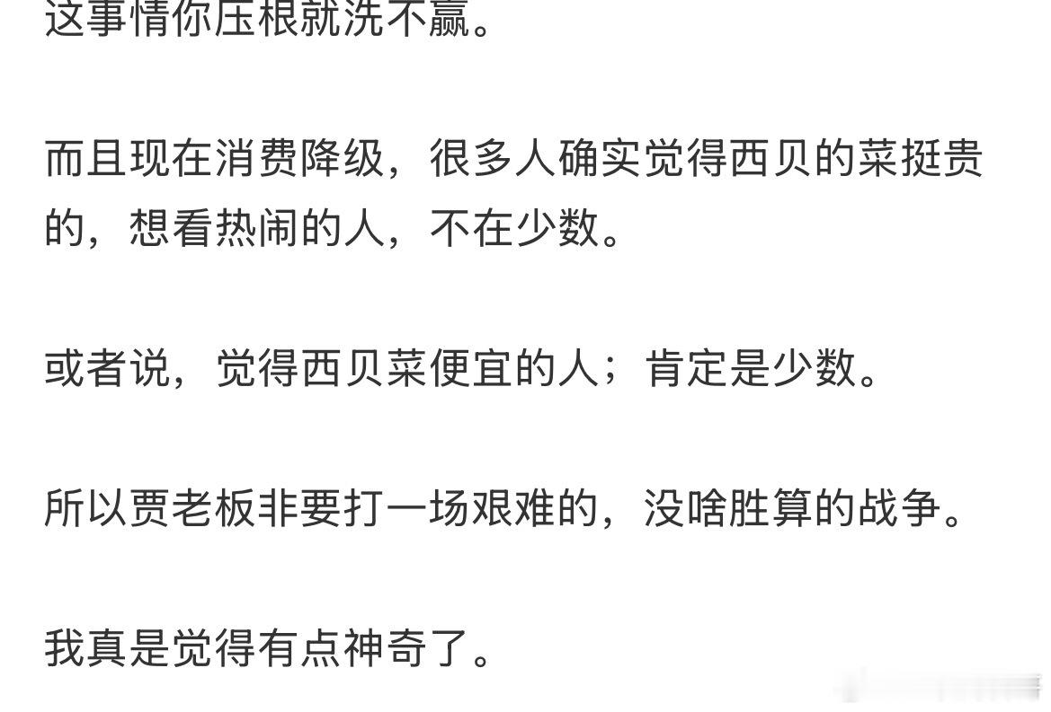 西贝发源地内蒙古老乡也看不懂西贝贾老板了!他说的挺在理的,没拉偏架,就觉得西贝老板的操作很神奇!非得打一场没有任何胜算的仗!
