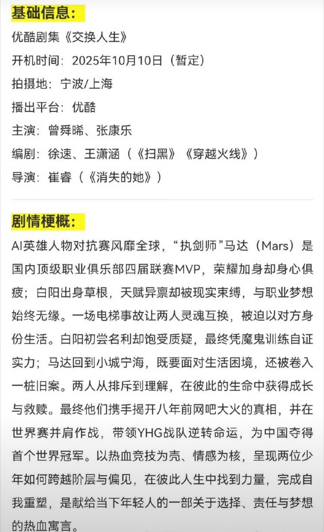 曾舜晞 张康乐 交换人生剧情梗概来了,10月开机。
