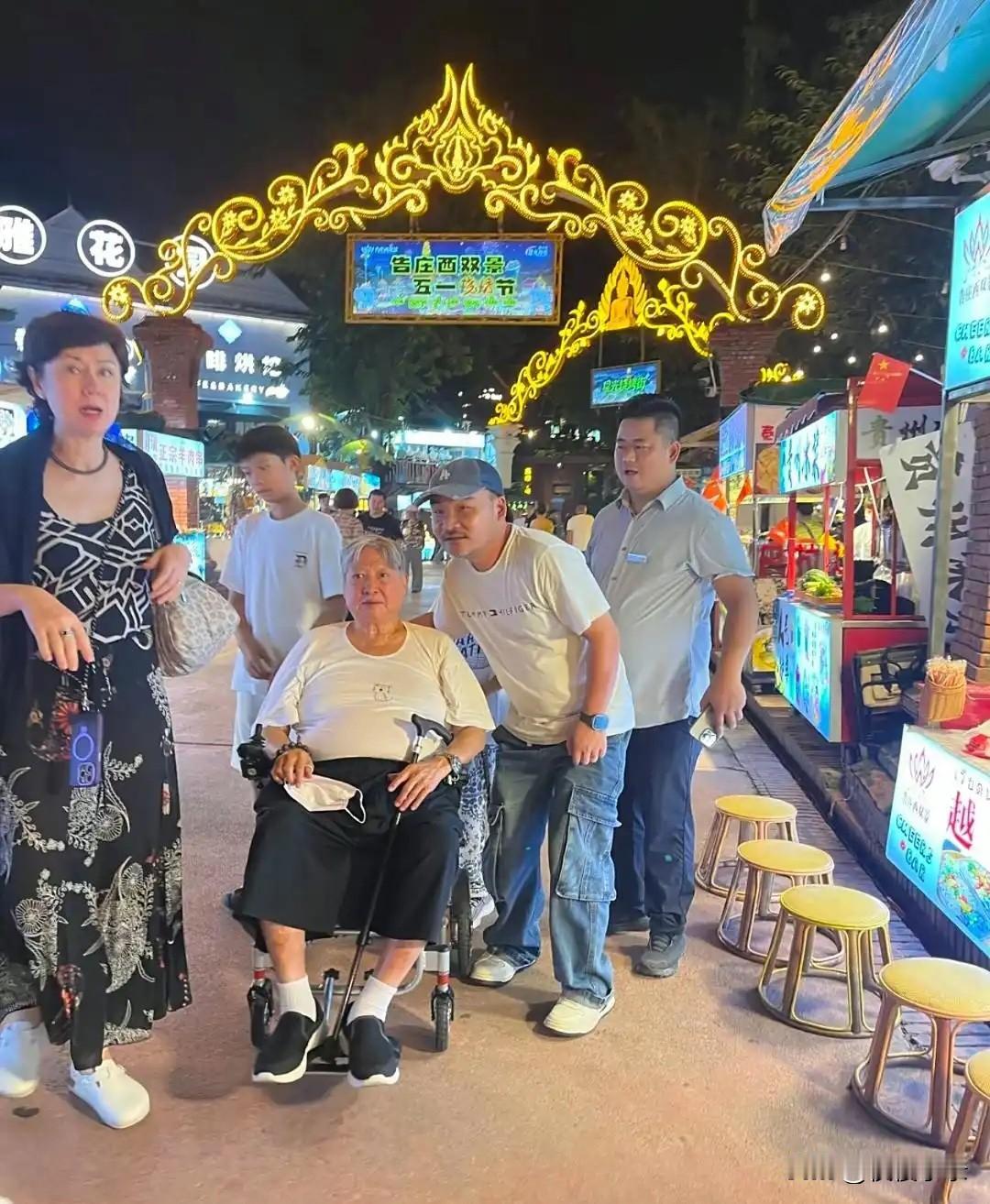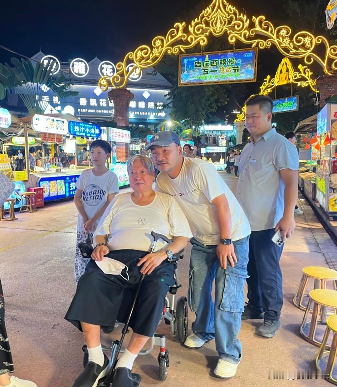 10月4日晚上,香港功夫巨星洪金宝和家人一起在西双版纳逛夜市,被好多游客偶遇。洪金宝因为腿部伤病,走路困难,所以他是坐着轮椅出现。他的穿衣打扮很朴素,一头白发苍苍,外表看起来苍老了好多,但毕竟他已经75岁了,属于正常衰老,状态已经非常不错了!也许是因为腿脚不便,缺乏运动,所以他整个人肥胖了好多,肚子上的赘肉很明显。 他的老婆高丽虹一直陪在他身边,她穿着一条黑色花纹长裙,肩膀上披着围巾,提着名牌包包,留着一头清爽的短发,看起来贵气十足![给力][给力]