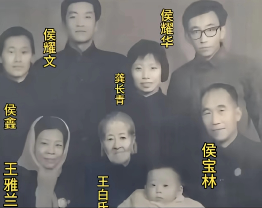 拍摄于1970年侯宝林从河南淮阳五七干校申请探亲假回到北京后。前排自右至左为侯宝林、侯军、王白氏、王雅兰;后排自右至左为侯耀华、龚长青、侯耀文、侯錱。