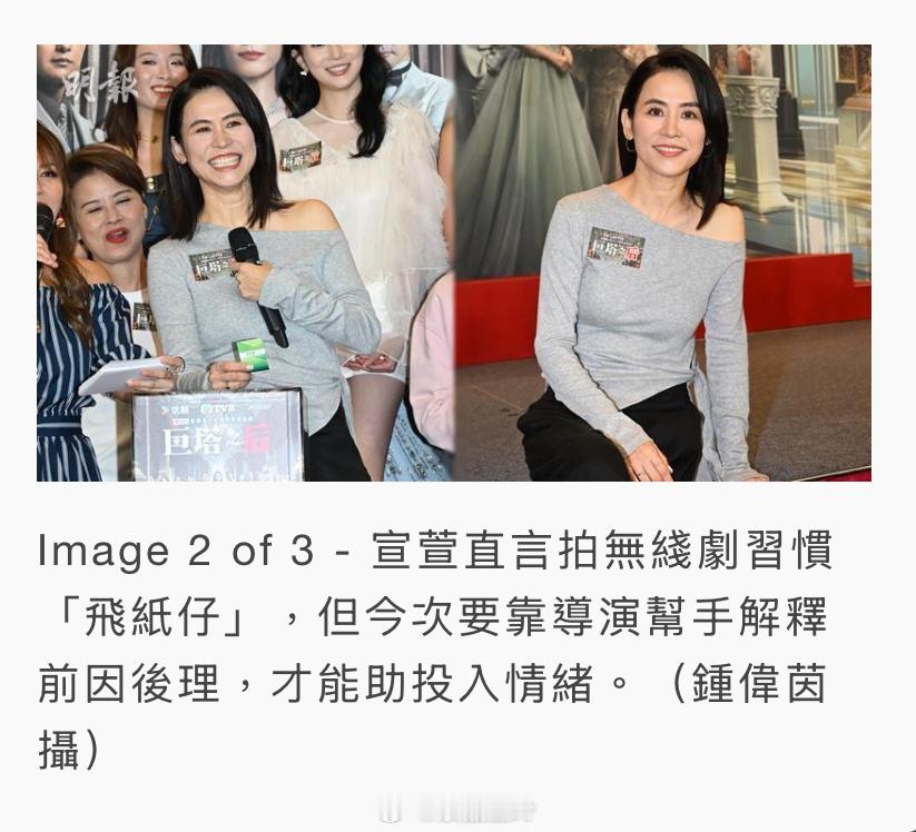 她直言拍無綫劇習慣「飛紙仔」,但今次要靠導演幫手解釋前因後理,才能助投入情緒,「當年拍《壹號皇庭》更嚴重,不過當年後生記對白快,現在記性真的不太好,可能要記4、5次才記到。」