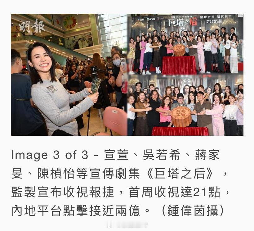 宣萱、吳若希、蔣家旻、陳楨怡等今天(5日)宣傳劇集《巨塔之后》,監製宣布收視報捷,首周收視達21點,內地平台點擊接近兩億。宣萱透露得知首集收視已超過20點,也十分開心,希望可以撐到尾。