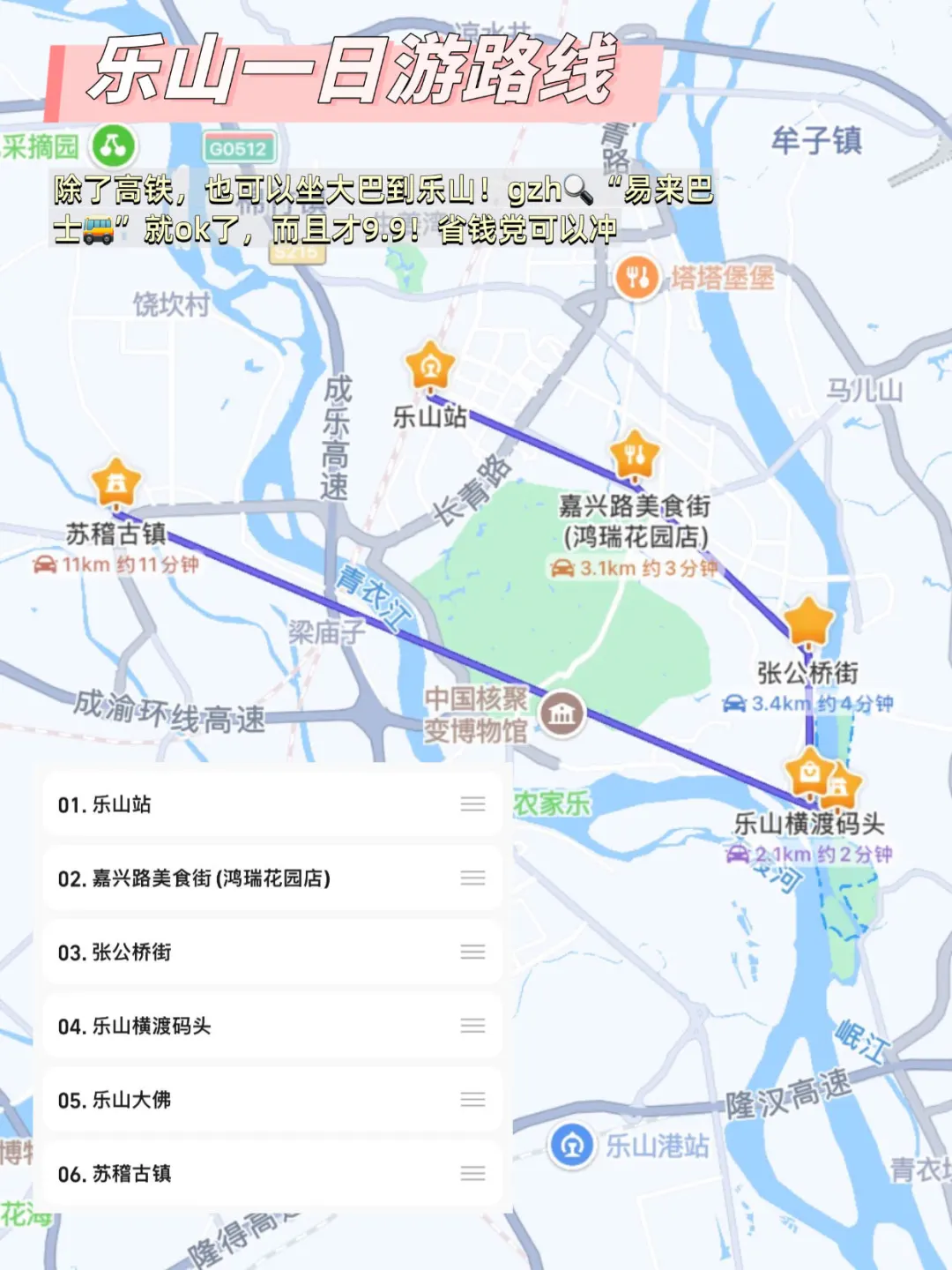 🪝乐山站→嘉兴路→嘉祥路→张公桥→乐山横渡码头→乐山大佛→苏稽古镇→乐山站