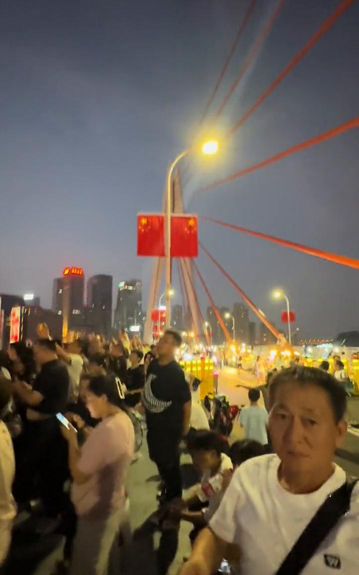 亮灯了,给大家看一下。十月五号重庆洪崖洞,好多人,今天还是很多人。现在是十月五号七点钟,那边月亮已经升起来了,给大家看一下。明天可以在这里看中秋月亮,今天还是很多人,不过人流量比起昨天、前天还是少的,人最多还是昨天跟前天。