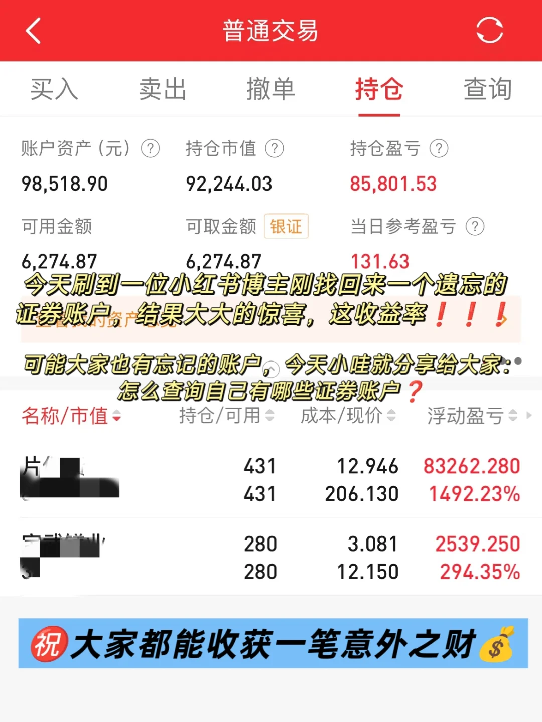 你知道自己开了几个户吗❓ 有没有遗忘的证券账户❓ 说不定有笔意外之财💰 相信很多人稀里糊涂开了几个户,有的已经很久远,忘了密码了,不知道里面有没有股票,这不我最近看到的有人竟然在找回的证券账户里发现自己之前买的股票,涨了1400%多❗快去看看自己的或者家里人的,说不定也有惊喜哟