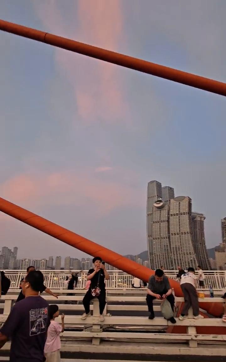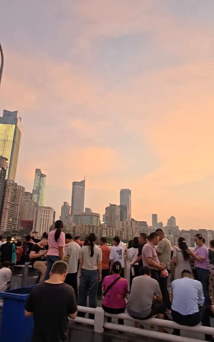 月亮出来了,明天中秋节,今天十月五号。重庆今天的晚霞好漂亮,给大家看一看。这是千石门大桥,那边是洪崖洞。明天晚上可以在这里看月亮,月亮真的还是很好的。明天是中秋节,明天重庆是晴天,明天成都下雨。欢迎成都的朋友到重庆来。这个晚霞真的好漂亮,今天这个晚霞太美了。