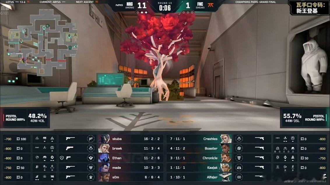 巴黎全球冠军赛总决赛NRG总决赛对阵FNC FNC生死局从1-11追到12-12爬进加时,再到13-12,13-13,14-13,15-13!
