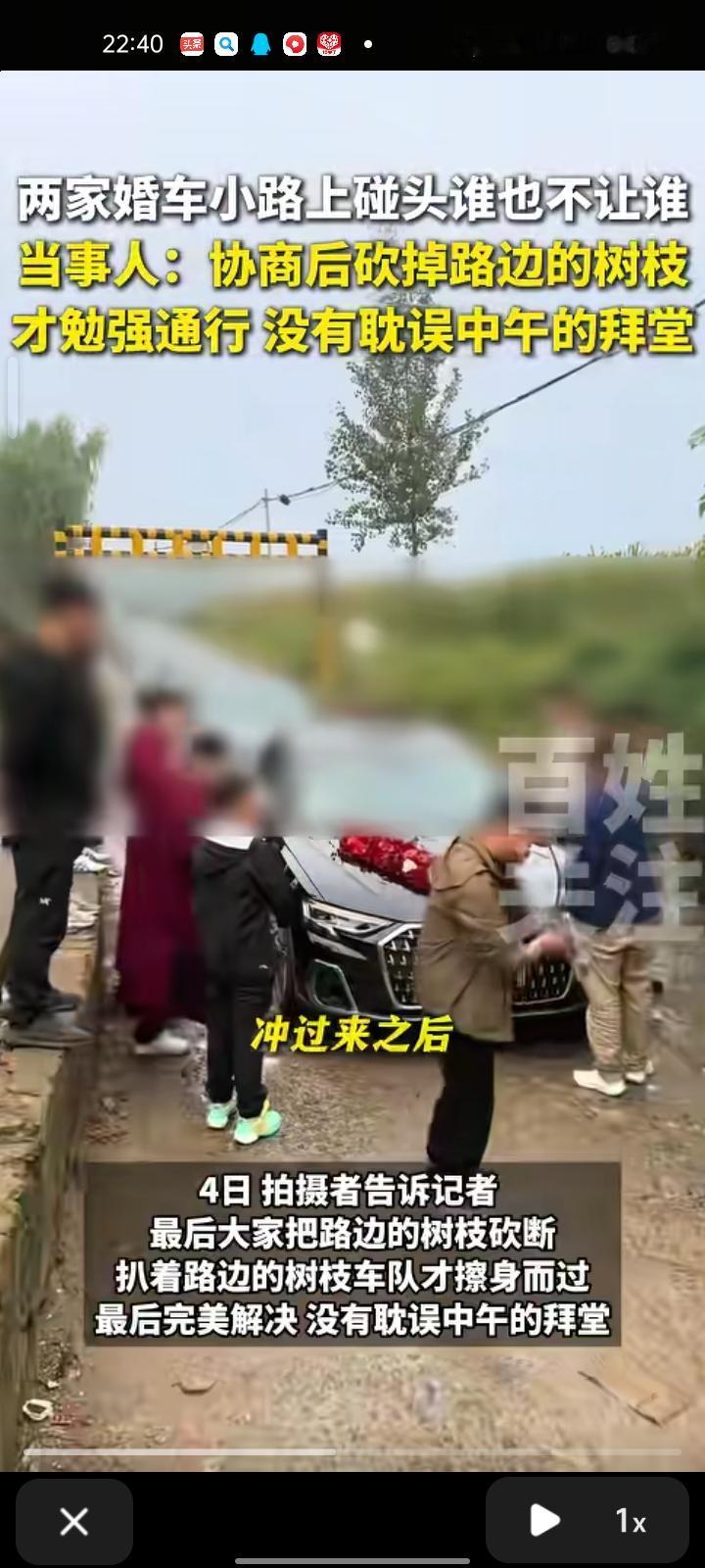 10月3日,山东菏泽。两家结婚的车队在过涵洞的小路相遇,谁也不让谁,最后双方堵在路上引发网友热议。拍摄者表示,最后大家把路边的树枝砍断,扒着路边的树枝车队才擦身而过,最后完美解决,没有耽误中午的拜堂。 这场涵洞对峙成为婚姻的绝妙比喻,新婚夫妻就像这两队婚车,未来路上难免磕磕碰碰,关键不是谁让谁,而是能不能一起想办法。如果谁都不让,这个婚注定是过不去。