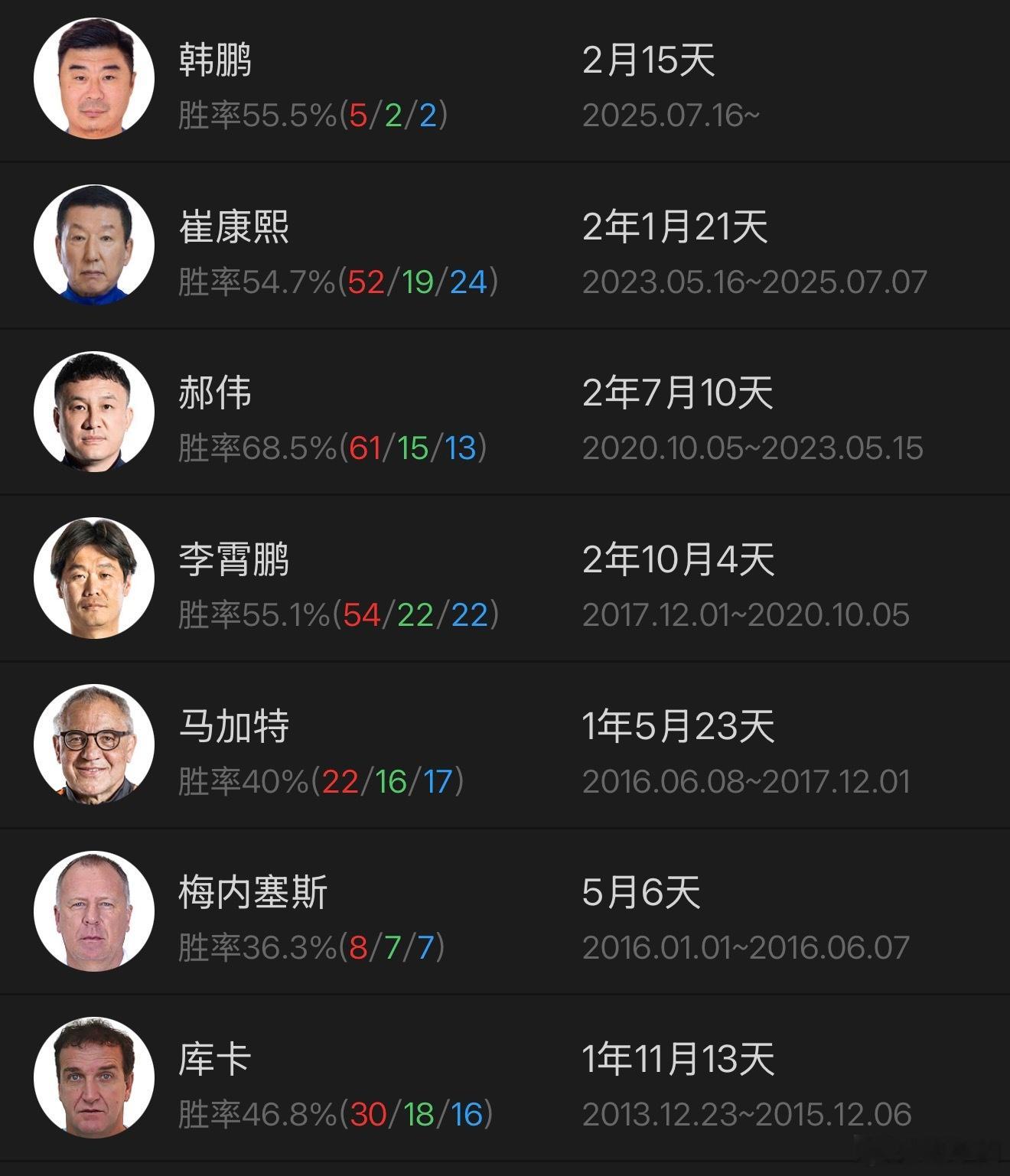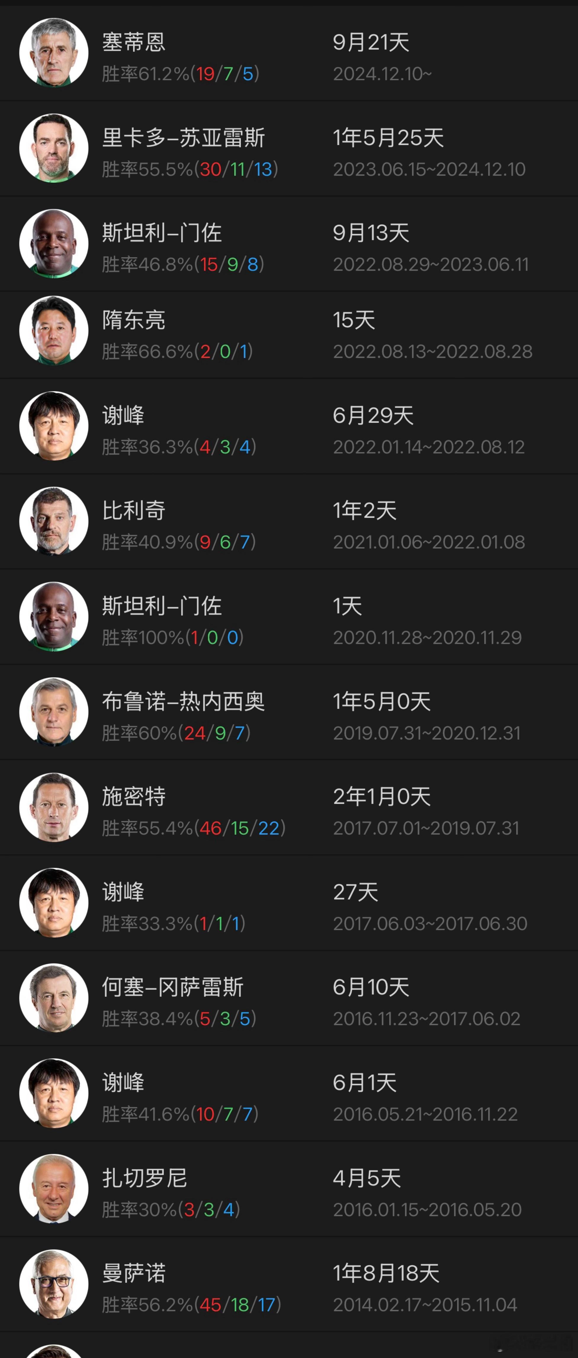 国安一共用过11位主教练或者代理教练。其中谢峰先后3次执教。