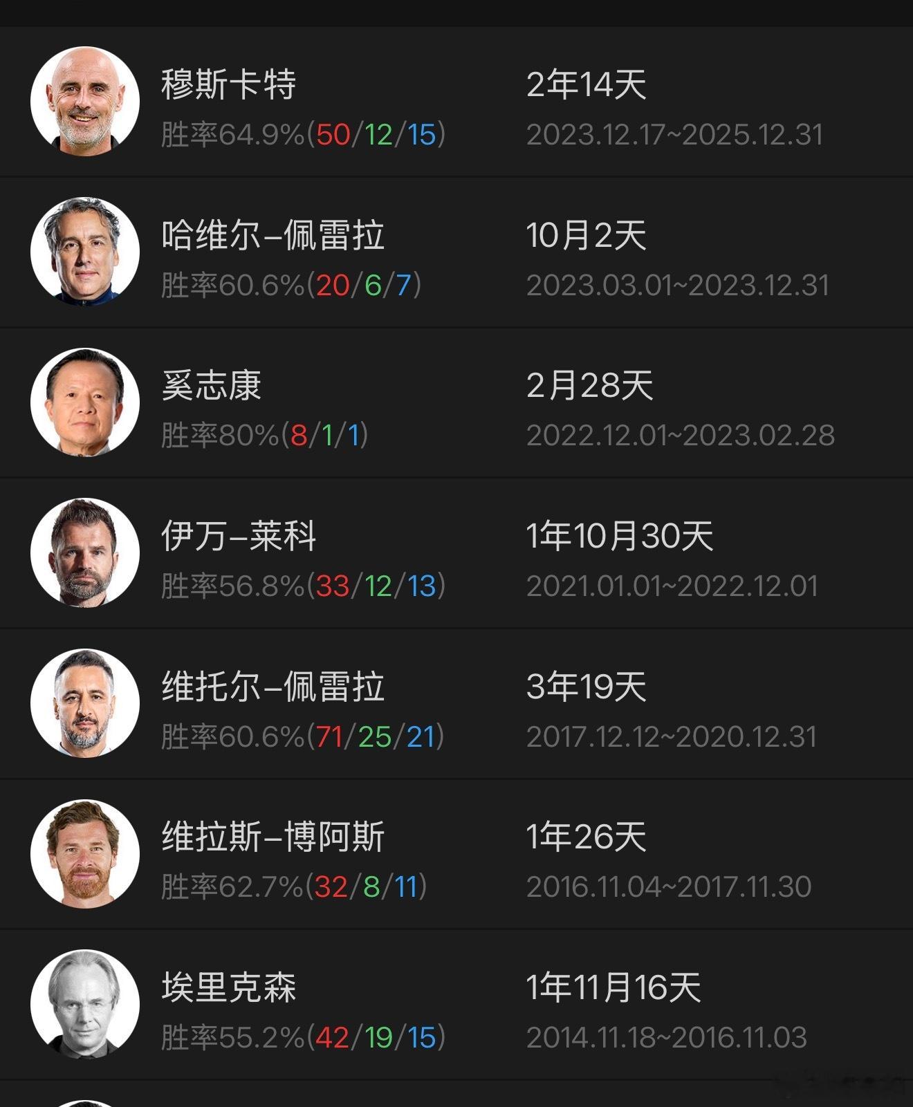 对比了从2015到2025,几支球队主教练(包括代理教练)数量。