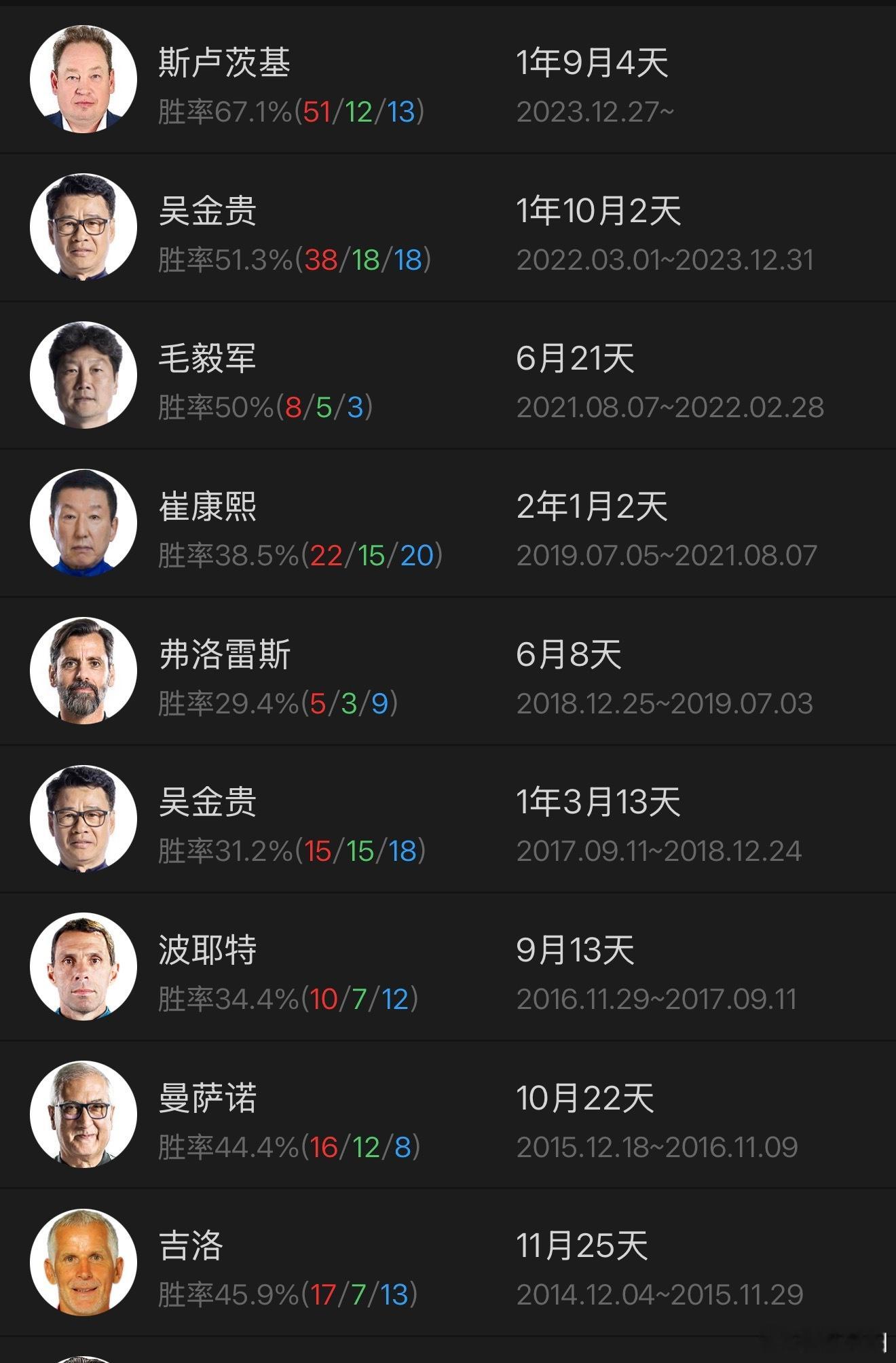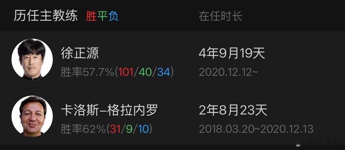 另外,成都蓉城徐正源是目前中超主帅里连续在位时间最长的,这个赛季结束,就连续执教蓉城5年了。