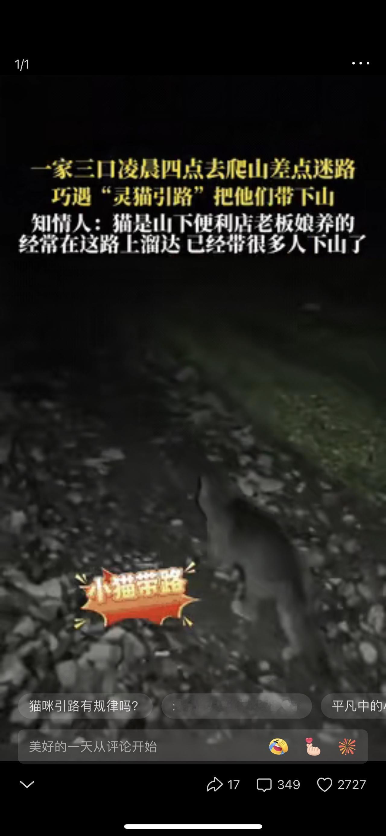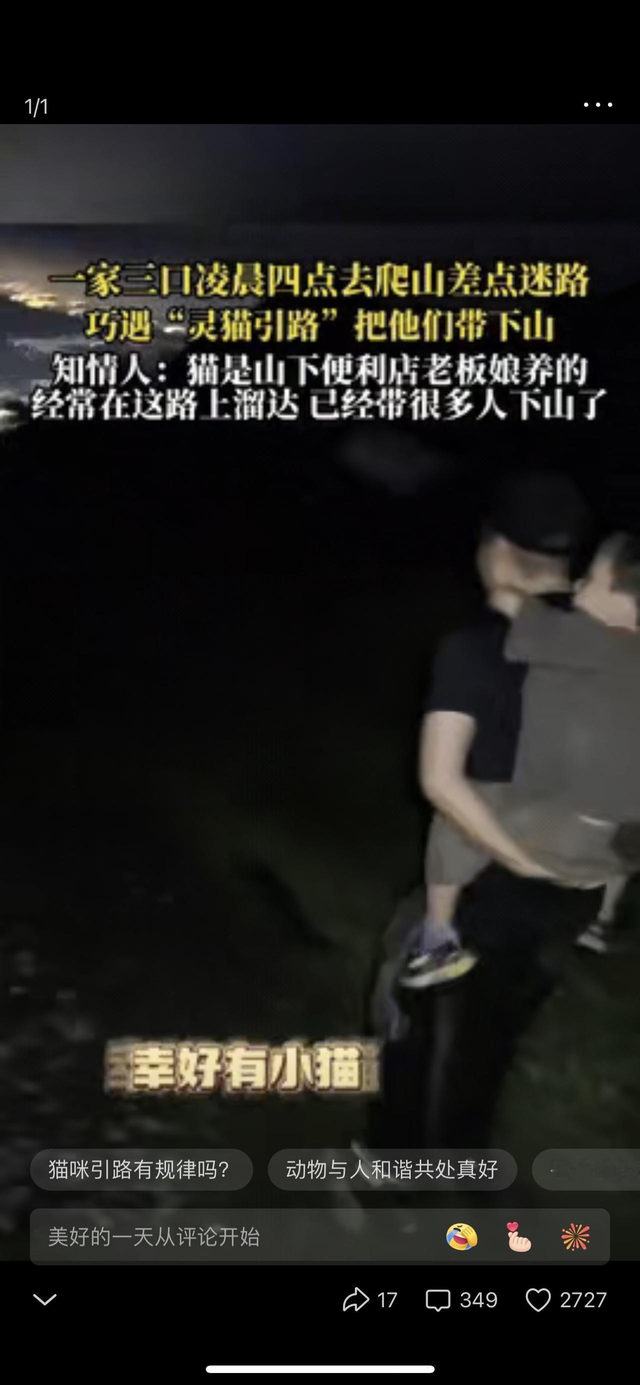 凌晨四点一家三口去爬山,在山上迷路了,这时一家人有点慌,正忐忑时,遇到了一只小猫咪,慢悠悠在前给他们引路,把这三口带下了山 。 一开始爸妈还觉得奇怪,这猫能认识路?孩子却兴奋地跟着猫跑,嘴里直喊“猫咪向导”。那猫走走停停,时不时回头看看他们有没有跟上,模样特别笃定。 走到一处陡坡,爸爸正发愁怎么下去,猫咪突然跳到旁边一条隐蔽的小径上,冲他们“喵”了一声。跟着走过去才发现,这条小路虽然窄,却平稳得多。 快到山脚时,天已经大亮,能看到熟悉的村落轮廓了。猫咪却没往村子走,而是拐进了旁边的果园。一家三口正疑惑,就见果园主人从屋里出来,笑着说:“你们是跟着小花下来的吧?它常给迷路的人带路呢。” 后来每次提起这事,孩子都嚷嚷着要再去爬山找那只猫咪。爸妈也觉得,那次迷路遇上猫向导,真是件又惊险又暖心的事儿。户外探险猫咪