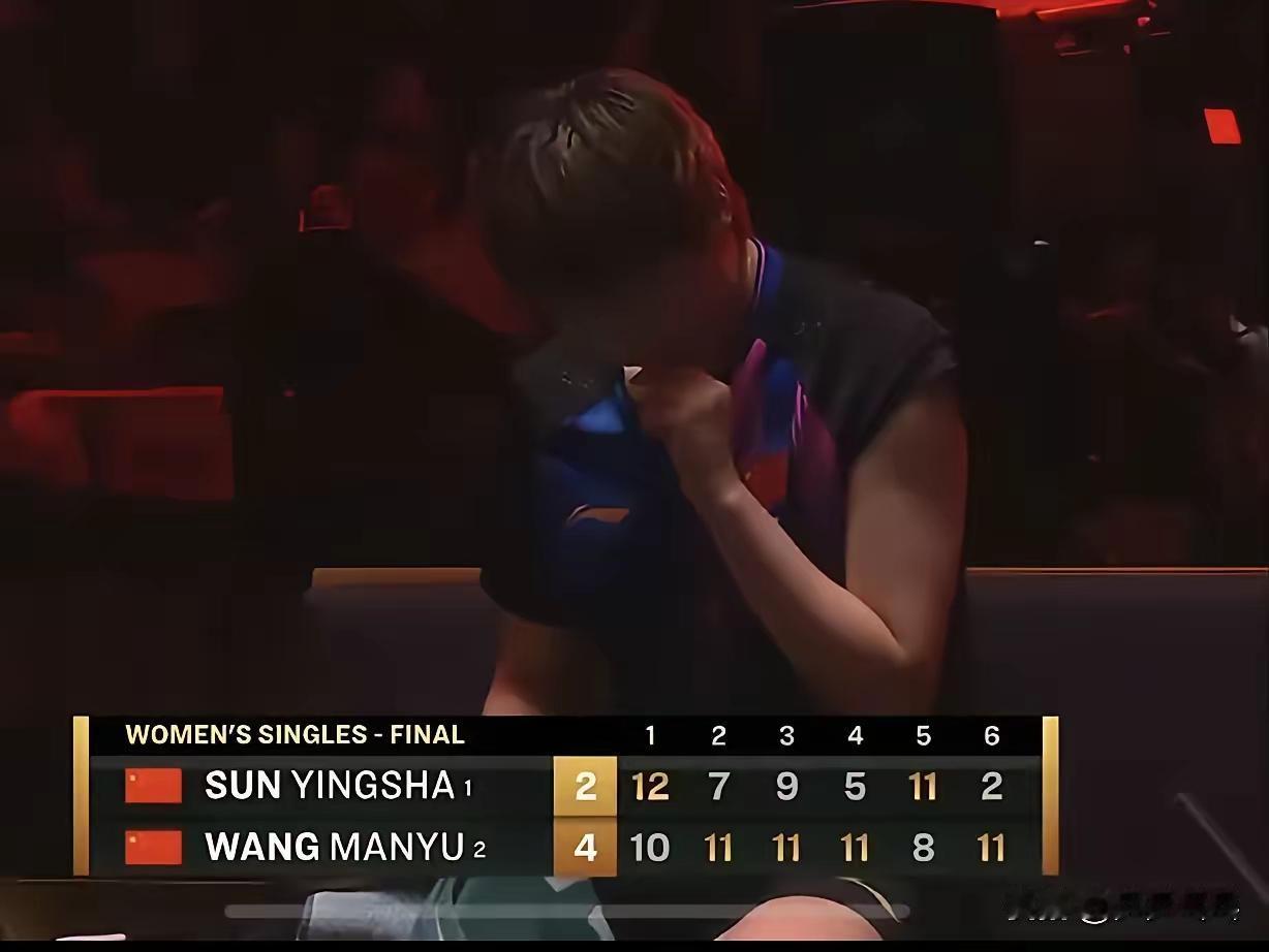 王曼昱赢了比赛,却没得到现场观众的掌声和祝贺,曼昱坐在椅子上稍显落寞。同是国乒的