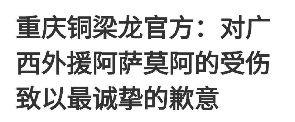 中甲25轮,重庆铜梁龙vs广西平果,身穿平果10号战服的外援阿萨莫阿在与对手拼抢中受伤。主帅前田浩二发布会上怒斥:重庆队就这么想赢吗?! 阿萨莫阿原是青岛红狮旧将,现年30岁,刚到广西平果没几个月,中场核心球员。 视频中可以清楚看到,两位球员追球到了边界附近,阿萨莫阿被对手从侧后方撞了一下,头部撞到前面的广告牌。据称脖子受伤不轻,疑似颈椎骨折。 平果还有另一位叫黄威的球员在这场比赛也受了伤,腿部骨折。 一场球,两个人被担架抬下去,难怪主帅发飙。