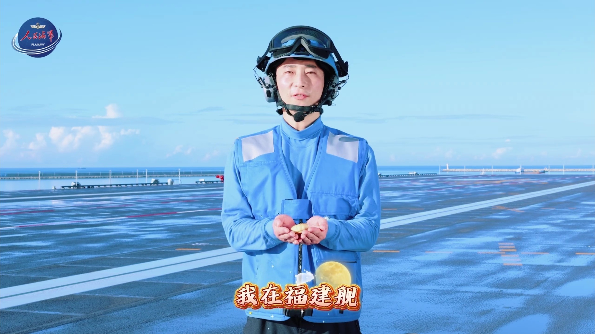 中秋停泊在军港的福建舰,舰员手捧月饼送上中秋祝福。