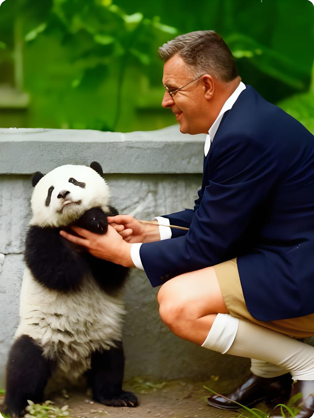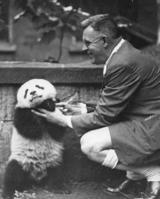 1938年5月18日的重庆,理查森博士的镜头捕捉到了戈登·琼斯与小熊猫潘多拉嬉戏的画面。照片里,戈登身着彼时流行的衬衫,搭配着所谓“最新款式”的裤子,姿态温和地与潘多拉互动——他的动作轻柔,似在同这只圆滚滚的小家伙逗趣。