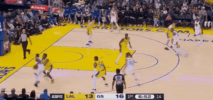 三分的神!库里无视防守强投三分命中! 在今天NBA季前赛勇士对阵湖人的第一节比赛