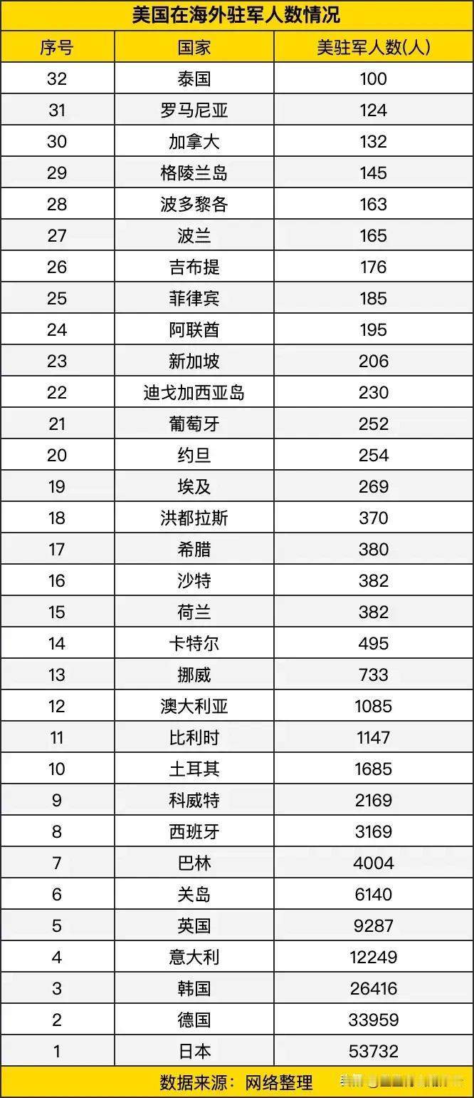 美国军事确实强大,从这张全球驻军人数表就可以窥见一斑了! 美国驻军最多的国家是日本,高达5.3万多人,其次是德国超3.3万人,再次是韩国也是令人惊叹的2.6万多人。即使边远人少的岛屿也有几百人,像处于北极圈内、今年特朗普口口声声要收归为美国国土的全球第一大岛屿格陵兰岛也驻军145人,还有更加遥远的海岛迪戈加西亚岛也驻军230人。这不难看出,美国的军事实力断崖式领先全球所有国家是有这个实力的,不然每年的军费开支比第二到第十的国家加起来的总和还多。 当然,也可以看出,美国的驻军防御重点在东北亚、欧洲、中东和东南亚。东北亚驻军的此的针对性很强,就是咱们,顺带是朝鲜和俄罗斯远东。欧洲驻军当初的防御重点是西德,如今是俄罗斯。中东就是伊朗了。东南亚也是咱们,说白了,美国在亚洲驻军两处是防着咱们的 一南一北防御着,真糟心啊。 不过,这次九三大阅兵展现了很多先进武器装备,咱们的防御能力大大提升,由近海走向远洋,也不怕谁,谁也不敢惹咱,咱就是这么任性。